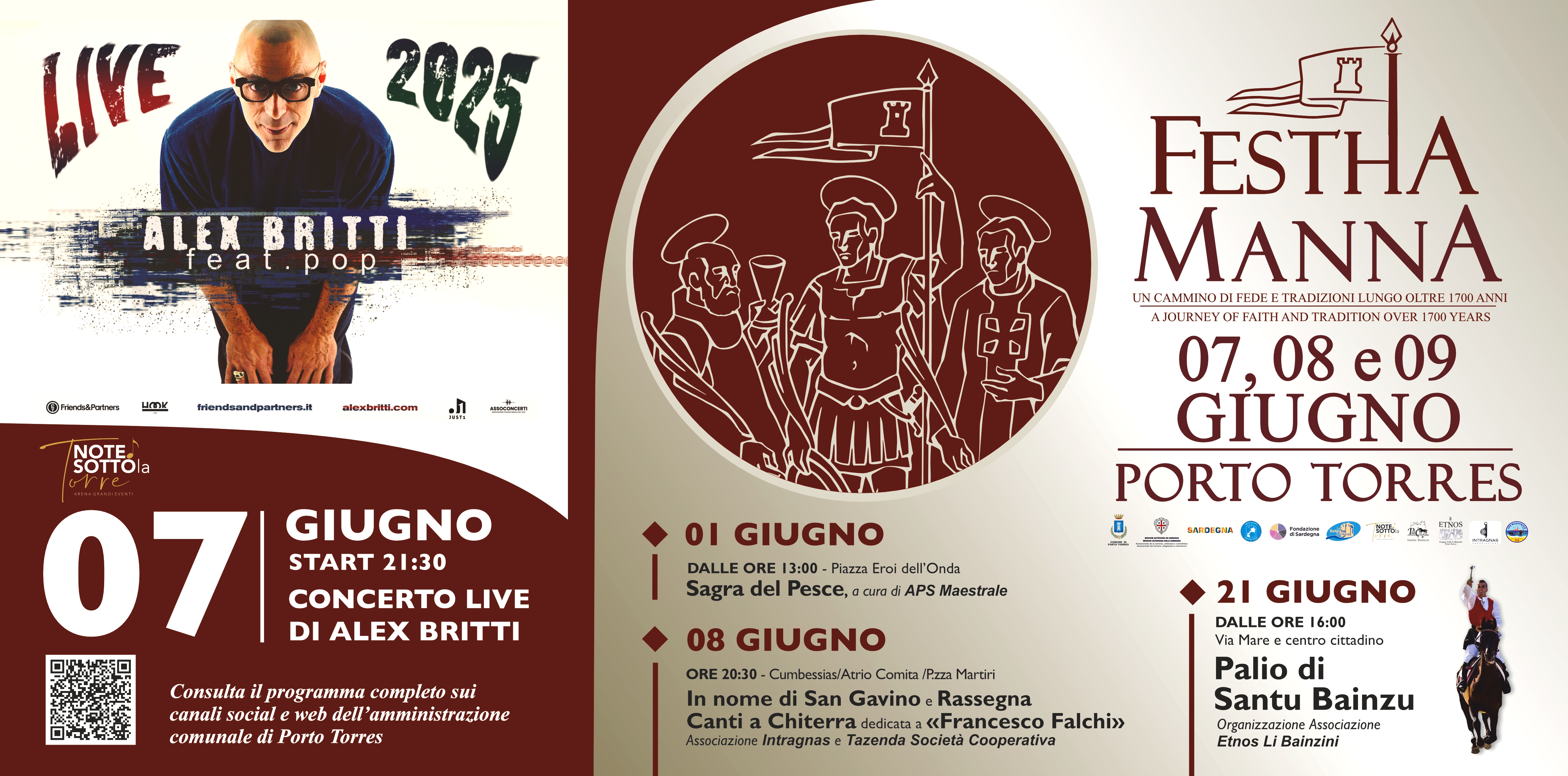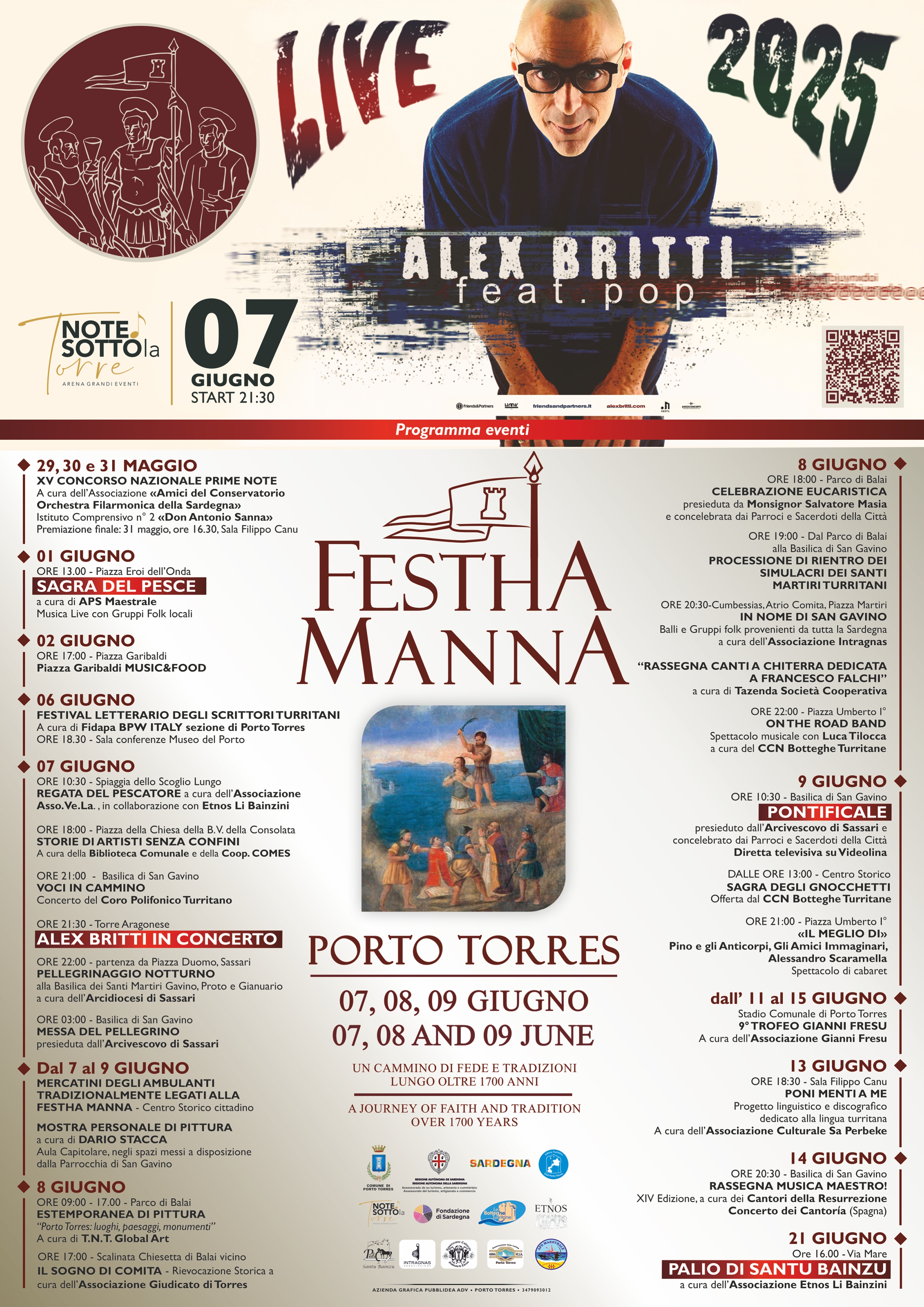 Ma la Festha Manna è anche un grande contenitore culturale, artistico e identitario. Tra gli appuntamenti più attesi c’è l’attesissimo concerto contraddistinto dal logo “Note sotto la Torre" che avrà come protagonista Alex Britti. Il cantautore e chitarrista romano, autore di successi come Solo una volta (o tutta la vita), Oggi sono io, Mi piaci e tanti altri famosissimi brani, sabato 7 giugno salirà sul palco allestito davanti alla Torre Aragonese di Piazza Colombo che negli anni scorsi ha ospitato artisti come Noemi, Le Vibrazioni e i Modena City Ramblers.