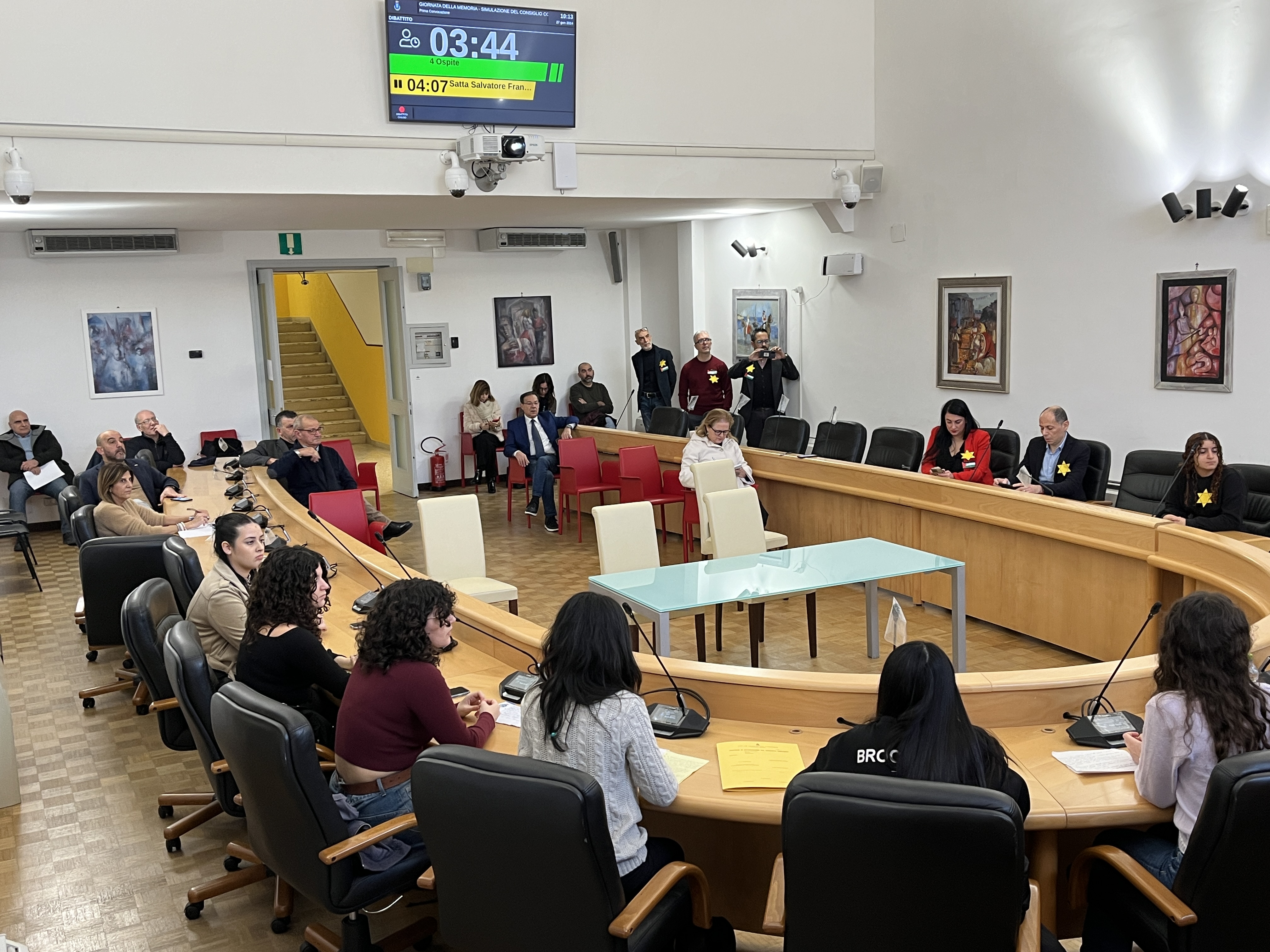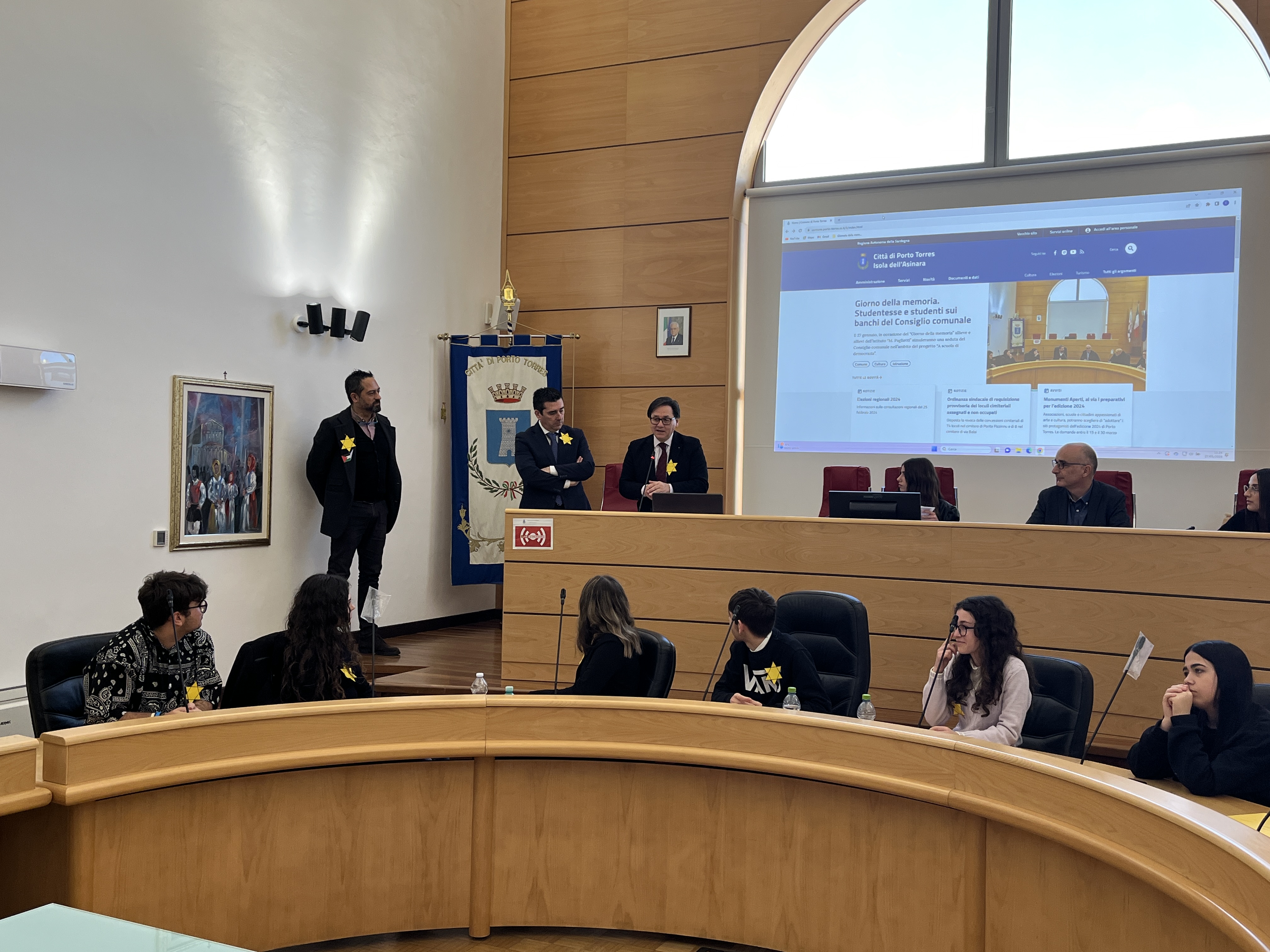 Hanno appuntato sui propri abiti il simbolo della Stella gialla di David e hanno interpretato con estrema serietà il ruolo di sindaco, assessori, consiglieri, presidente del Consiglio comunale e segretaria verbalizzante. Sono le studentesse e gli studenti dell’Istituto “M. Paglietti” di Porto Torres che sabato 27 gennaio, in occasione del “Giorno della memoria”, la giornata internazionale indicata dall’Assemblea generale dell’Onu nel 2005 per ricordare la Shoah, hanno simulato una seduta dell’Assemblea civica nel palazzo del municipio. L’iniziativa, inserita nel progetto di formazione alla cittadinanza attiva “A scuola di democrazia” che ha preso il via al Paglietti lo scorso mese di novembre, ha visto ragazze e ragazzi impegnati nella discussione di un unico punto all’ordine del giorno: “Discussione aperta su iniziative e presidi permanenti contro ogni forma di discriminazione da realizzare nella Città di Porto Torres in occasione la celebrazione della Giornata della Memoria".