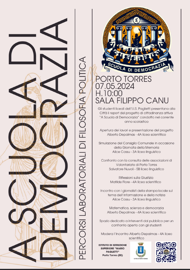 L'Istituto “M. Paglietti” di Porto Torres martedì 7 maggio, alle ore 10.00 nella sala Filippo Canu in Corso Vittorio Emanuele II, presenterà l’evento finale legato al progetto di educazione alla cittadinanza attiva-politica “A Scuola di democrazia- percorsi laboratoriali di filosofia”, promosso dall’Istituto nel corso dell’anno scolastico.