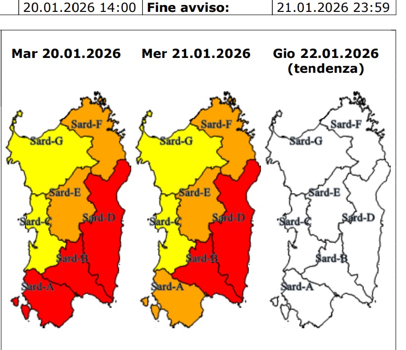 - codice ROSSO (criticità ELEVATA) per RISCHIO IDROGEOLOGICO, codice ARANCIO (criticità MODERATA) per RISCHIO IDRAULICO sull'area di allerta Iglesiente