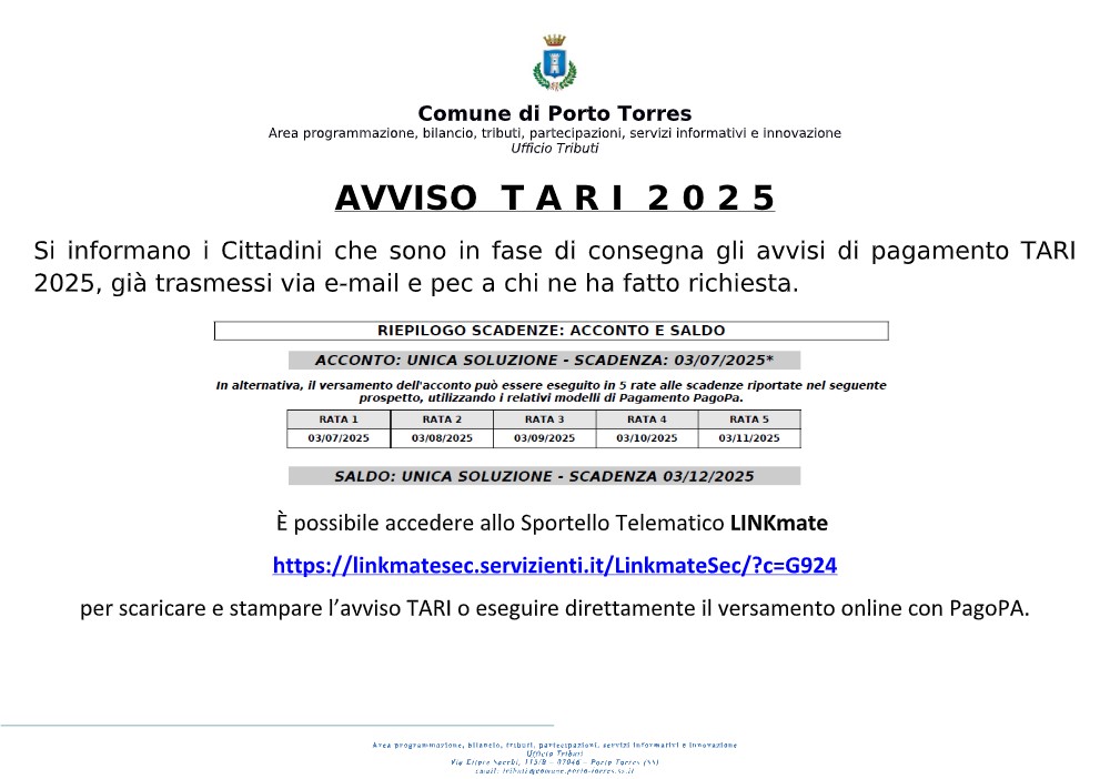 Si informano i Cittadini che sono in fase di consegna gli avvisi di pagamento TARI 2025, già trasmessi via e-mail e pec a chi ne ha fatto richiesta.