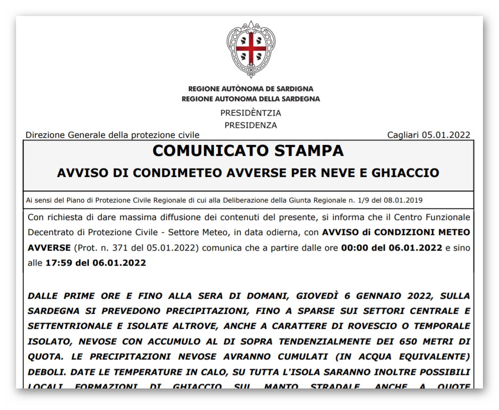 Comunicazione della Protezione civile regionale: "Dalle prime ore e fino alla sera di domani, giovedì 6 gennaio 2022, sulla sardegna si prevedono precipitazioni, fino a sparse sui settori centrale e settentrionale e isolate altrove, anche a carattere di rovescio o temporale isolato, nevose con accumulo al di sopra tendenzialmente dei 650 metri di quota. Le precipitazioni nevose avranno cumulati (in acqua equivalente) deboli. Date le temperature in calo, su tutta l'isola saranno inoltre possibili locali formazioni di ghiaccio sul manto stradale, anche a quote inferiori ai 650 metri".