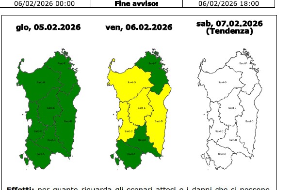 - codice giallo (criticità ordinaria) per rischio idraulico sulle aree di allerta Montevecchio Pischinappiu, Flumendosa Flumineddu, Tirso, e Logudoro
