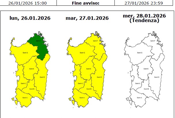 - codice GIALLO (criticità ORDINARIA) per RISCHIO IDRAULICO e RISCHIO IDROGEOLOGICO sulle aree di allerta Iglesiente, Campidano, Montevecchio Pischinappiu, Tirso, Flumendosa Flumineddu, Gallura e Logudoro