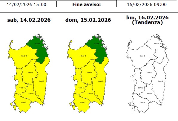 - codice GIALLO (criticità ORDINARIA) per RISCHIO IDRAULICO e RISCHIO IDROGEOLOGICO sulle aree di allerta Iglesiente, Campidano, Montevecchio Pischinappiu, Flumendosa Flumineddu, Tirso, e Logudoro
