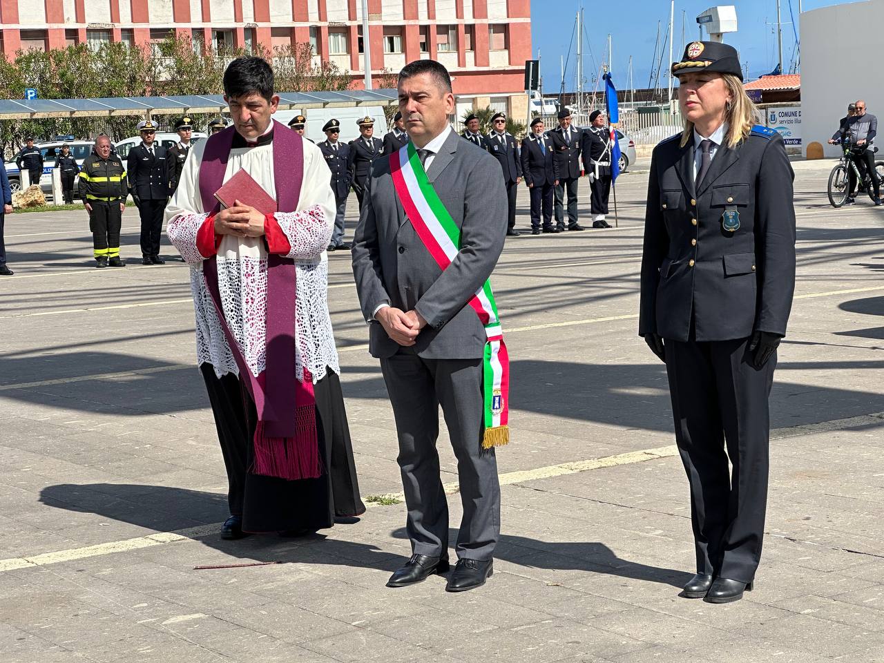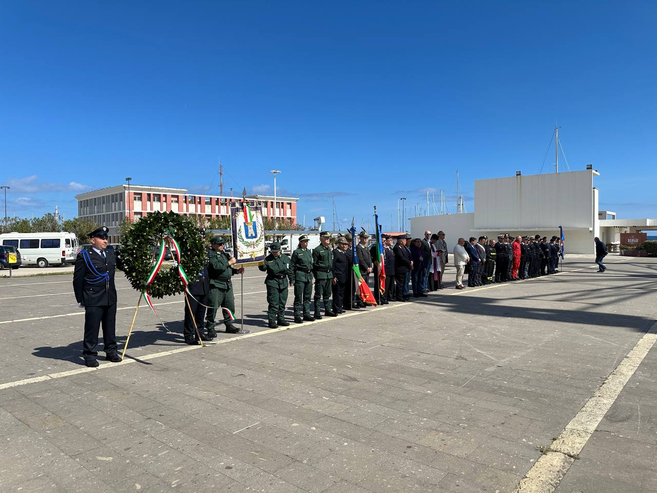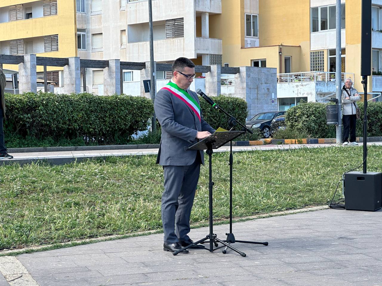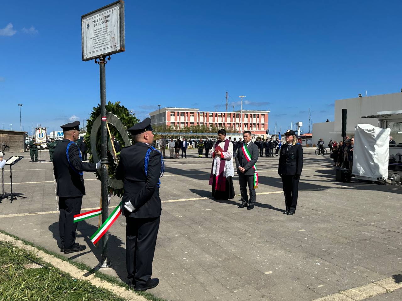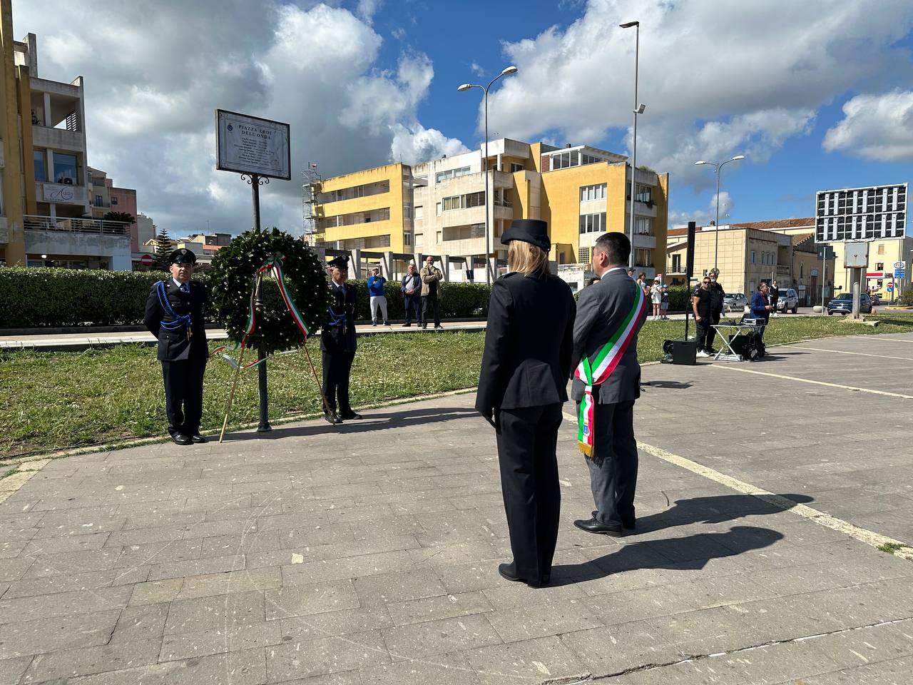 Dopo il raduno nella piazza, il sindaco Massimo Mulas, accompagnato dalla comandante della Polizia Locale Maria Caterina Onida, ha deposto una corona d’alloro ai piedi della palina segnaletica inaugurata nel 2023 in occasione dell’80° anniversario, che riporta incisi i nomi dei 9 marinai dell’Onda. Don Salvatore Masia, parroco della Basilica di San Gavino ha quindi impartito la benedizione in memoria dei caduti e a seguire, sulle note solenni del “Silenzio”, il primo cittadino ha pronunciato il suo discorso commemorativo: