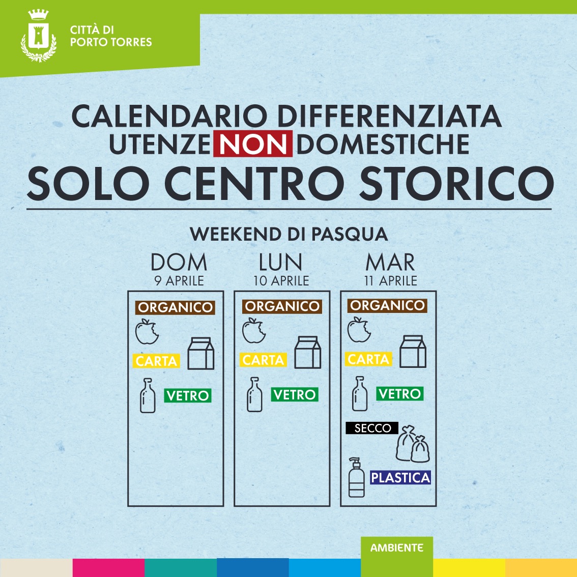 Nelle giornate di Pasqua e Pasquetta NON è prevista nessuna raccolta né per le utenze domestiche né per quelle non domestiche.