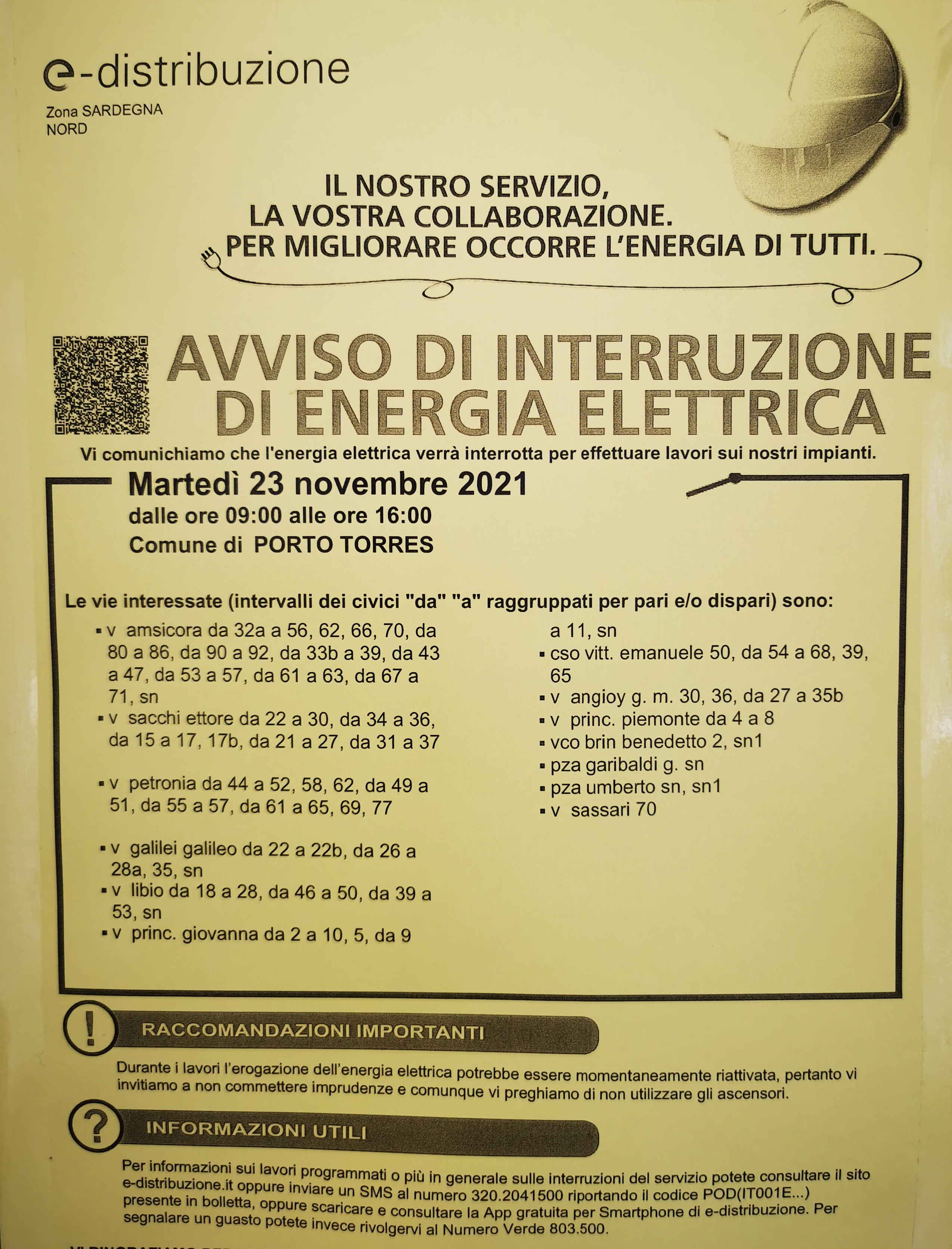 E-distribuzione ha comunicato che martedì 23 novembre in diverse vie del centro sarà interrotta l'erogazione dell'energia elettrica, dalle 9 alle 16. Il disagio interesserà le vie Amsicora, Ettore Sacchi, Petronia, Galilei, Libio, Principessa Giovanna, Corso Vittorio Emanuele, Angioy, Principe di Piemonte, vicolo Brin, piazza Garibaldi, piazza Umberto e un tratto di via Sassari. L'elenco preciso dei numeri civici è presente nell'immagine allegata.