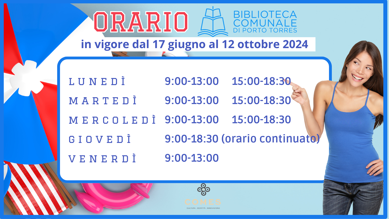 La biblioteca comunale “Antonio Pigliaru” di Porto Torres dal 15 giugno segue l’orario estivo che resterà in vigore fino al 19 ottobre. La struttura in via Sassari n 8 è aperta dal lunedì al venerdì. Il lunedì, il Martedì, Mercoledì dalle 9 alle 13 e dalle 15:00 alle 18:30. Il giovedì con orario continuato dalle 9 alle 18:30 e il venerdì dalle 09:00 alle 13:00. Sabato chiuso
