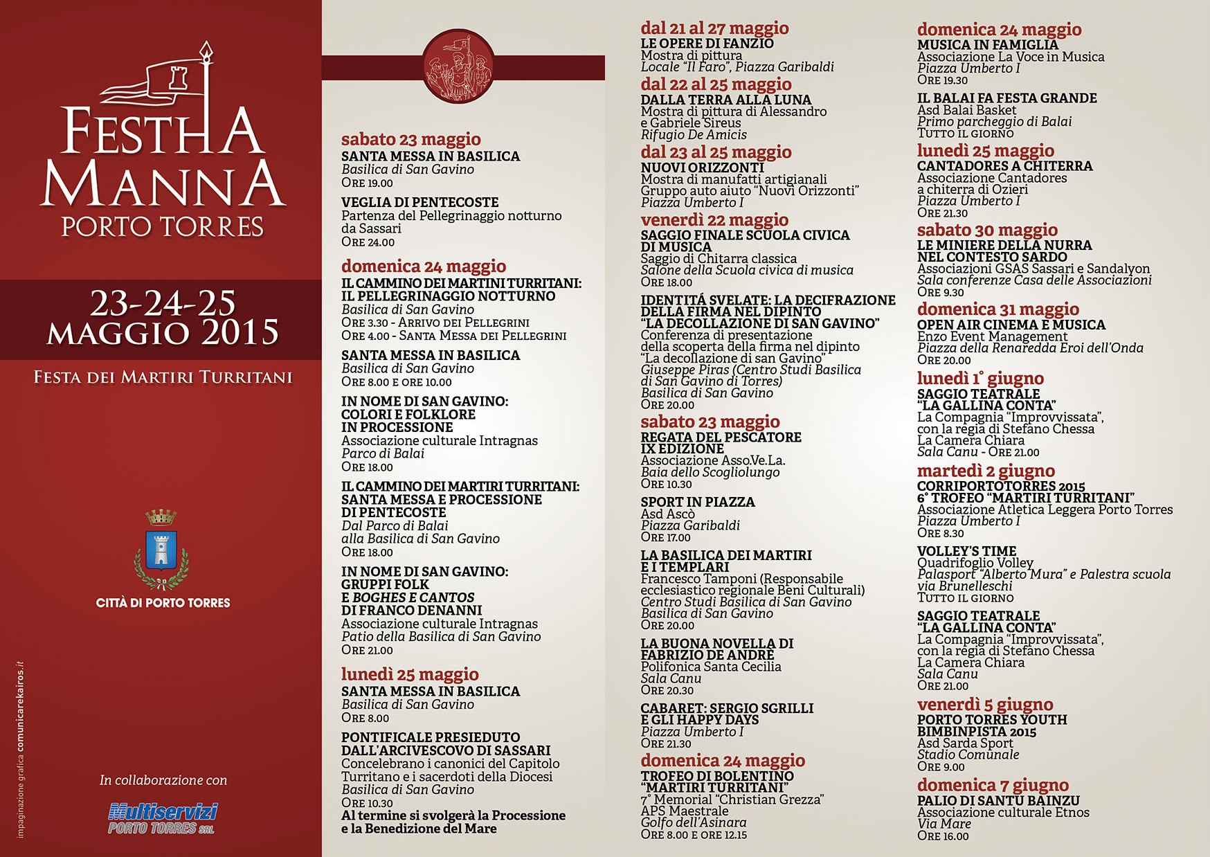 Riti e celebrazioni per i Santi Martiri Turritani. Una fede tramandata nei secoli che si rafforza nei giorni della Festha Manna, in concomitanza con il ritorno dei simulacri lignei di Gavino, Proto e Gianuario, la domenica di Pentecoste, nella Basilica di San Gavino. La città è pronta ad accogliere fedeli, pellegrini e gruppi in costume che dal 23 maggio onoreranno i Martiri venerati in tutta la Diocesi. Dalla notte del sabato sino a lunedì si ripeteranno gli antichi rituali per ricordare il soldato Gavino, il presbitero Proto e il diacono Gianuario, decapitati più di 1700 anni fa sulla rupe di Balai durante le persecuzioni dei cristiani.