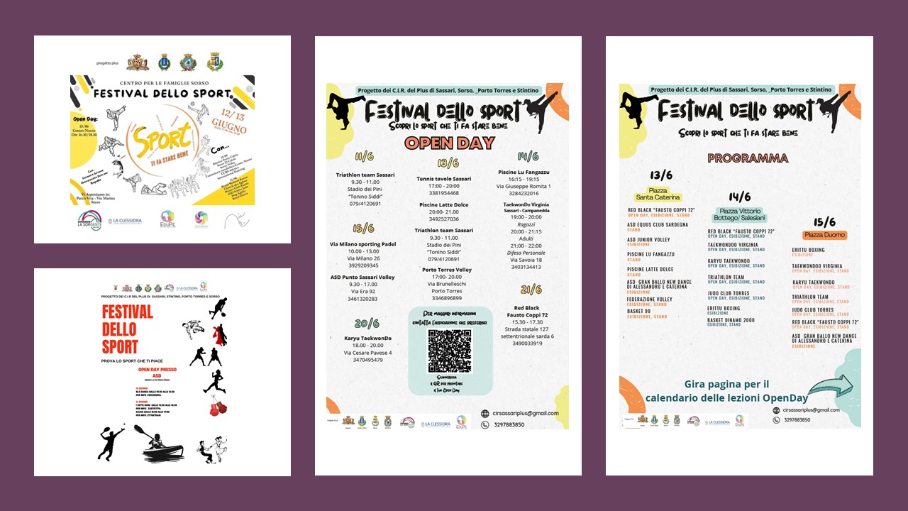 Il FESTIVAL DELLO SPORT rientra tra le iniziative del progetto Centri in Rete e ha la finalità di incentivare la pratica sportiva oltreché di creare contesti aggregativi informali tra i giovani e Comunità. L’evento si svolge a Sorso, Sassari e Porto Torres, prevede OPEN DAY presso le ASD aderenti e presidi in Piazza, con canestri, biliardino, palloni e tanto altro per il gioco libero. Diverse Associazioni si esibiranno dal vivo e coinvolgeranno i presenti nelle loro attività.