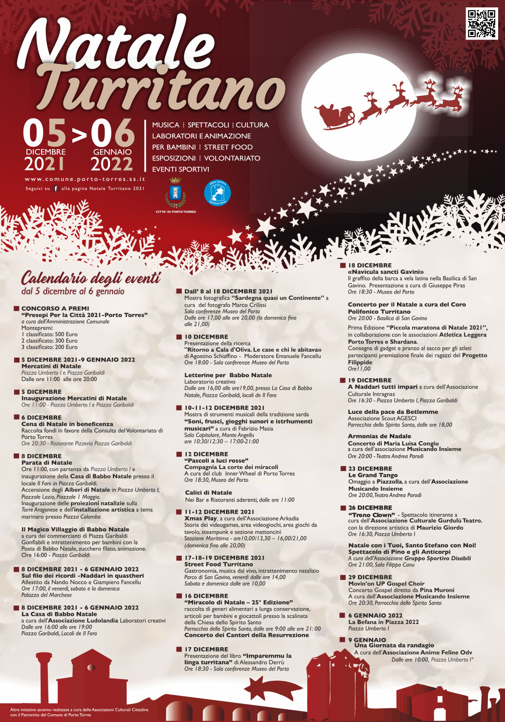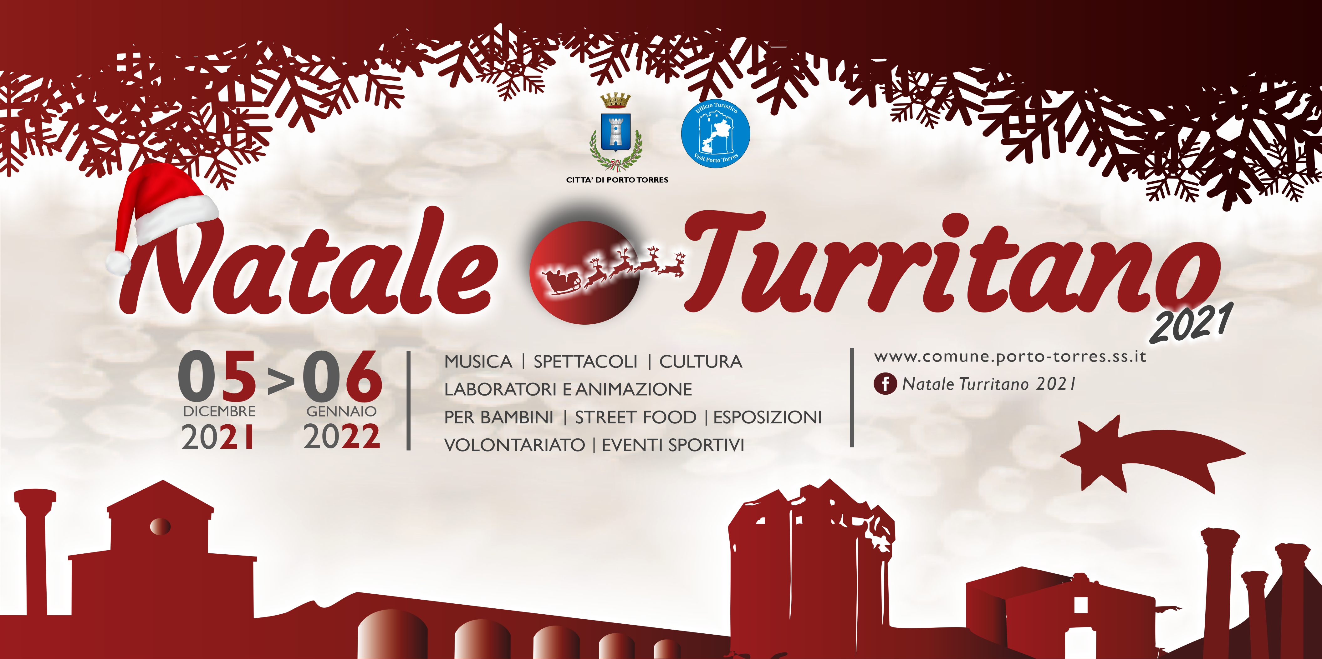 Il 17, 18 e 19 dicembre in Parco di San Gavino ospiterà una delle novità del Natale turritano, l'evento di gastronomia, musica dal vivo, intrattenimento natalizio organizzato da Street Food Turritano: tre giornate di degustazioni, eventi, concerti e attività per i più piccoli. L'ingresso al Parco sarà contingentato: massimo 200 persone per volta. Il 17 dicembre nel Museo del Porto sarà presentato il libro Imparemmu la linga turritana di Alessandro Derrù. Il 18 dicembre, Giuseppe Piras presenterà nel Museo del Porto "Navicula Sancti Gavini, il graffito della barca a vela latina nella basilica di San Gavino. Sempre il 17 dicembre l'Associazione BSL Studiodanza presenterà "Peter Pan", alle 21 al Parodi: coreografie e regia di Clelia Bazzoni e Fabiana Sechi. Il 18 dicembre si terrà la Piccola maratona di Natale in collaborazione con le associazioni Atletica leggera Porto Torres, Shardana e il Progetto Filippide, mentre la basilica di San Gavino ospiterà il Concerto per il Natale a cura del Coro polifonico turritano. Il 19 dicembre in piazza Umberto e in piazza Garibaldi Intragnas promuoverà A Naddari tutti impari, mentre l'associazione scout Agesci organizzerà nella parrocchia dello Spirito Santo Luce della pace da Betlemme; al Teatro Parodi sarà poi la volta del concerto di Maria Luisa Congiu Armonias de Nadale, a cura dell'associazione Musicando insieme.