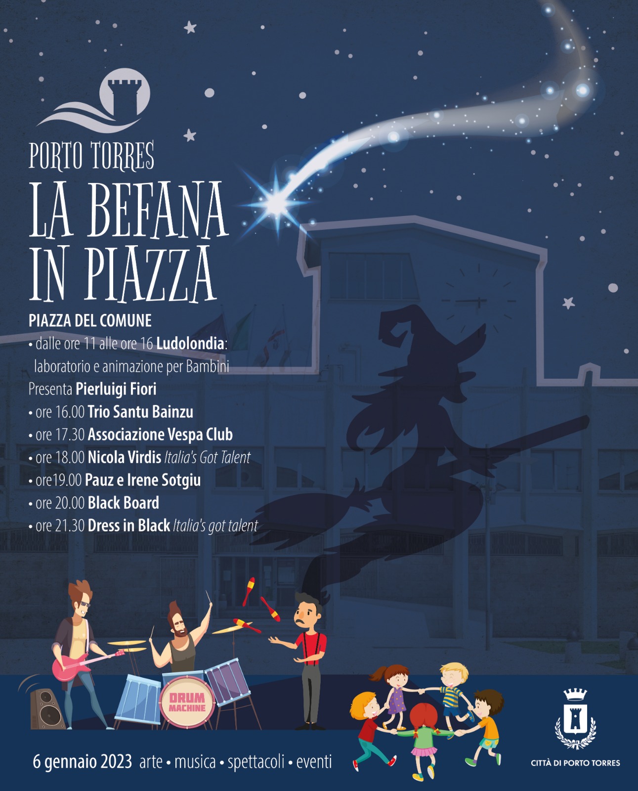 A Porto Torres torna il tradizionale appuntamento con la Befana. Il 6 gennaio piazza Umberto ospiterà il cartellone di eventi promosso dal Comune, con una serie di appuntamenti rivolti a un pubblico di tutte le età. La giornata inizierà alle 11 con Ludolandia, attività di laboratorio e animazione che coinvolgerà i bambini fino al primo pomeriggio. Alle 16 prenderà il via l'evento vero e proprio con una sequenza di artisti presentati da Pierluigi Fiori. A inaugurare la serata sarà il Gruppo Santu Bainzu che proporrà un repertorio con i classici della musica folk dialettale. A seguire, alle 17 e 30, l'associazione Vespa Club che guiderà una sfilata al centro con i motociclisti vestiti da Befana. Alle 18 sarà la volta di un artista conosciuto al grande pubblico: il comico e giocoliere Nicola Virdis, noto anche per il successo ottenuto a Italia's Got Talent. Alle 19 toccherà al rapper Pauz accompagnato da Irene Sotgiu che presenterà tra le altre cose il suo ultimo singolo. Alle 20 si terrà il concerto di una band turritana che sta ottenendo consensi in tutta l'isola, i Black Board, mentre alle 21 e 30 chiusura con Dress in Black, cover band sarda tutta al femminile, che suonerà il repertorio degli AC/DC.