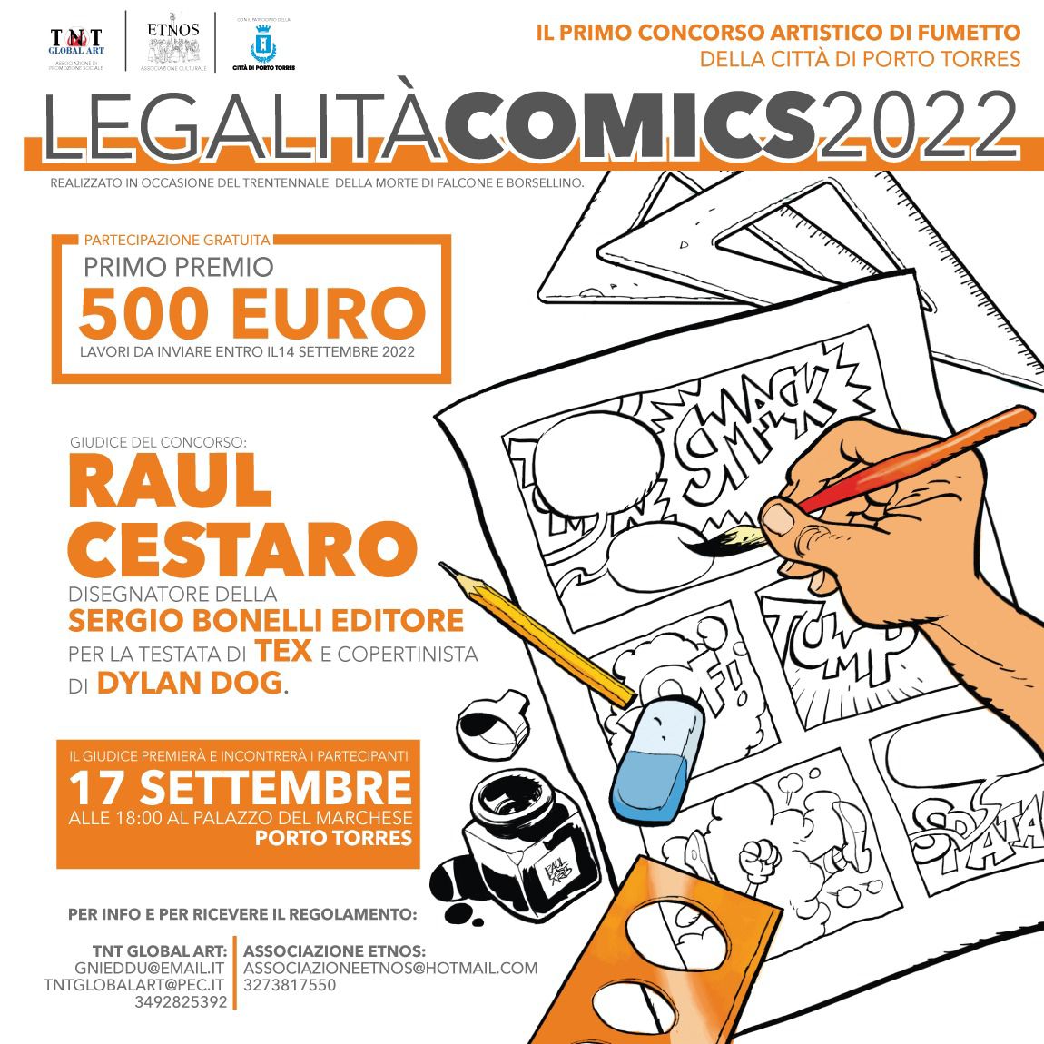 Le associazioni TNT GLOBAL ART ed ETNOS, in collaborazione l’Aministrazione Comunale di Porto Torres organizzano, in occasione del trentennale degli attentati ai giudici antimafia Giovanni Falcone e Paolo Borsellino, la prima edizione di “LEGALITÀ COMICS 2022, primo concorso artistico di fumetto della città di Porto Torres”, concorso pubblico di fumetto finalizzato alla realizzazione di uno short graphic novel, in bianco e nero o a colori ed in lingua italiana, che abbia come tema la legalità e la sua difesa. Il progetto vincitore, selezionato da Raul Cestaro, disegnatore della Sergio Bonelli Editore per la testata di Tex e copertinista della serie regolare di Dylan Dog, riceverà in premio la somma in denaro di 500,00 euro; inoltre, una selezione delle opere migliori sarà esposta al pubblico presso il “Palazzo del Marchese”, sede istituzionale della città di Porto Torres, e presso il medesimo si svolgerà la premiazione stessa.