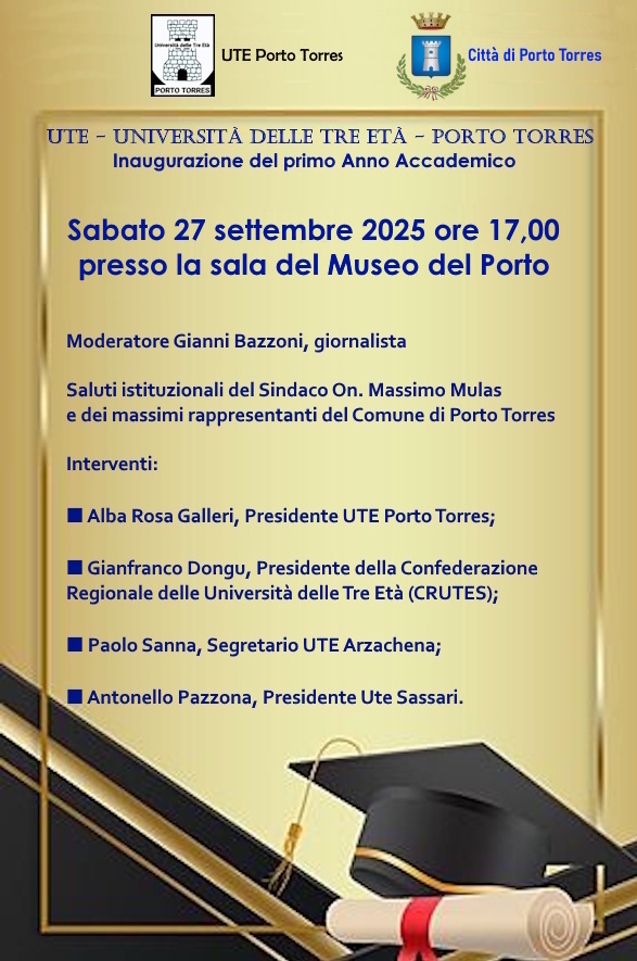 All’appuntamento, moderato dal giornalista Gianni Bazzoni, prenderà parte il Sindaco Massimo Mulas insieme a diversi esponenti dell’Amministrazione comunale, la presidente dell’UTE Porto Torres Alba Rosa Galleri, Gianfranco Dongu, presidente della Confederazione Regionale delle Università delle Tre Età (CRUTES), Paolo Sanna, segretario UTE Arzachena e Antonello Pazzona, presidente UTE Sassari.
