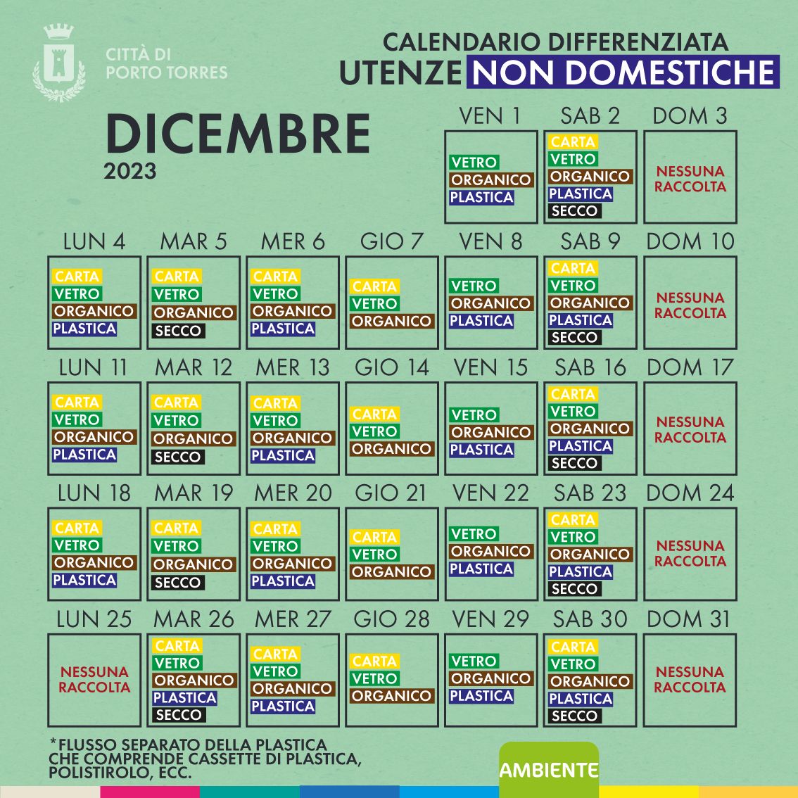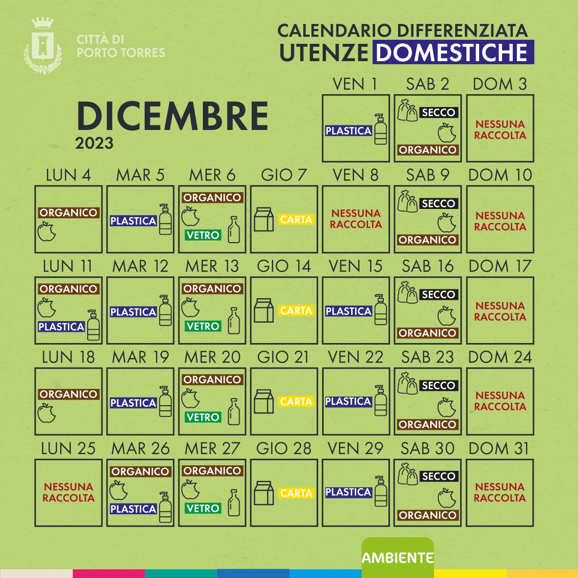 - 26 dicembre (S.Stefano) previsto ritiro di tutte le tipologie di rifiuto (carta, vetro, secco, organico, plastica
