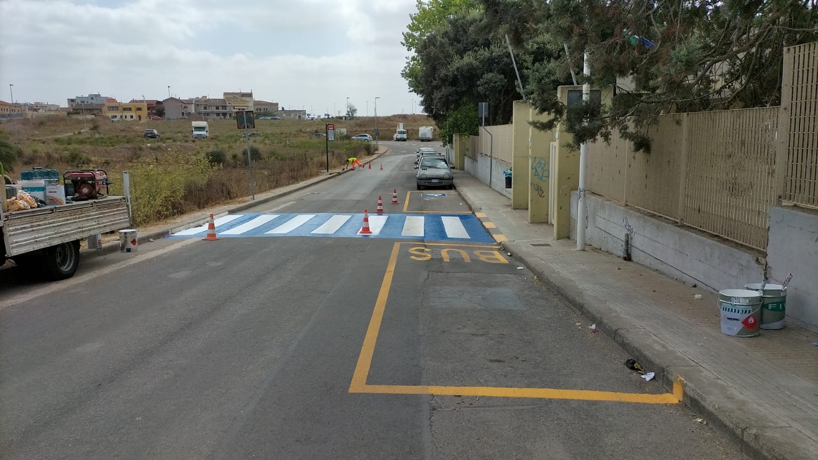Nuova segnaletica orizzontale di fronte alle scuole. La Multiservizi sta effettuando una serie di interventi di manutenzione, pulizia e sfalcio nei pressi di alcuni edifici scolastici, in vista della ripresa delle attività didattiche. I lavori interessano per ora via Porrino (scuole Monte Angellu), via delle Vigne (Istituto Dessì) dove sono state ridisegnate le strisce pedonali e gli stalli per i disabili e via Brunelleschi: qui e in altre strade - via Francesconi e Balai alta - si sta procedendo anche allo sfalcio delle erbacce.