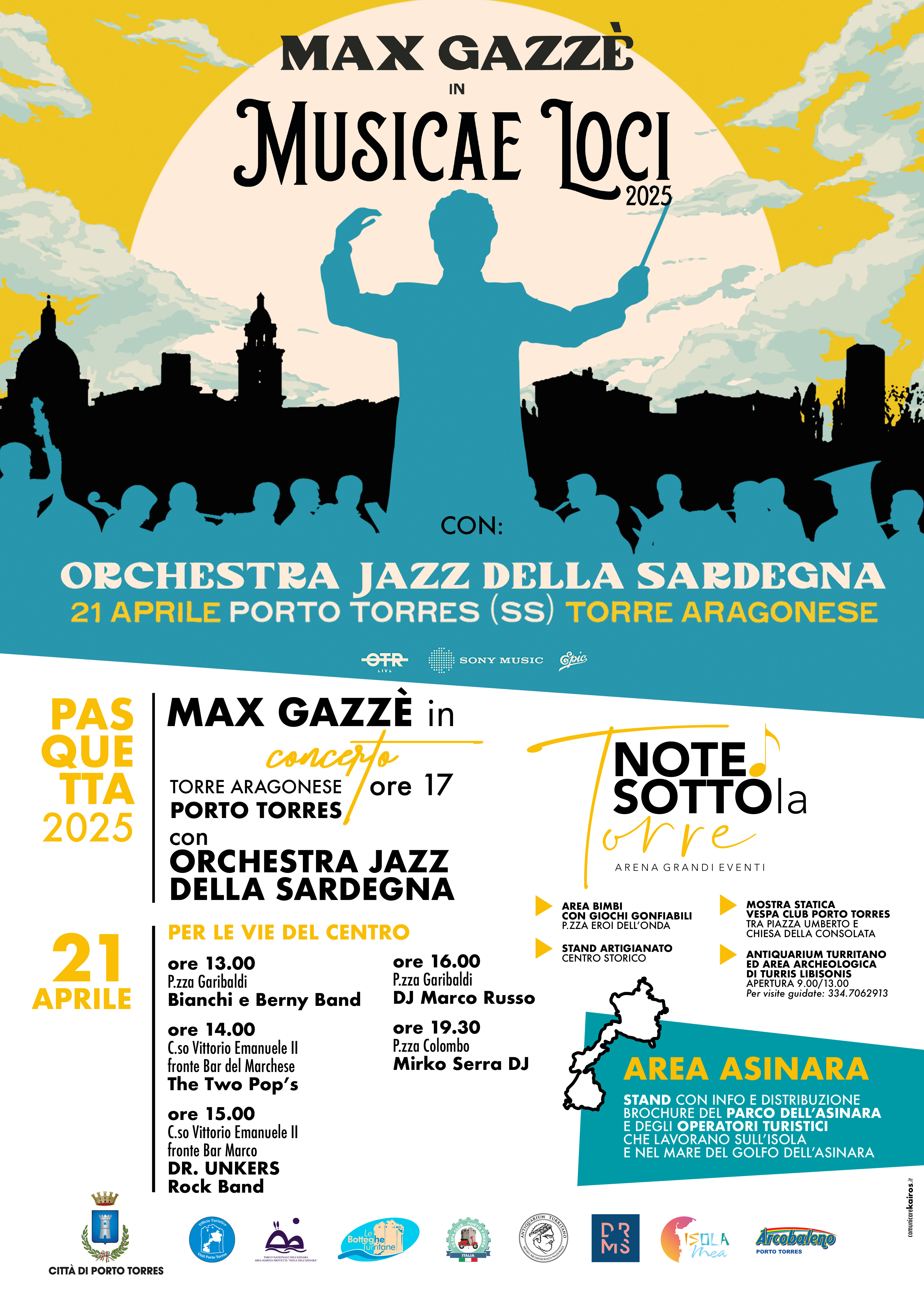 “Musicae Loci” è l’appuntamento di punta di una giornata che darà spazio anche a band e artisti locali che suoneranno nei diversi locali del centro cittadino a partire dalle 13. Ma la Pasquetta turritana prenderà il via già dal mattino quando, alle 11, aprirà ufficialmente la grande area pedonale che dal Corso Vittorio Emanuele si estenderà fino a via Mare ospitando bancarelle, mercatini dell’artigianato e dell’ingegno e chioschi per la somministrazione di cibo e bevande. Intanto, tra piazza Umberto I e la Chiesa della Consolata, gli appassionati delle due ruote potranno ammirare una splendida mostra statica di Vespe storiche organizzata dal Vespa club di Porto Torres mentre i più piccoli potranno divertirsi nell’area bimbi allestita con i giochi gonfiabili in Piazza Eroi dell’Onda. L’area dedicata alla promozione dell’Asinara sarà predisposta in piazza Colombo, dove si potranno scoprire le meraviglie dell'isola gioiello grazie agli operatori del Parco. Il ricco e singolare patrimonio faunistico e floreale dell’isola sarà promosso anche attraverso le installazioni artistiche realizzate dalla ditta Arcobaleno e la proiezione su un maxischermo di suggestive immagini messe a disposizione da Daniele Amato di ISOLA MEA e dedicate alle sue bellezze naturalistiche.