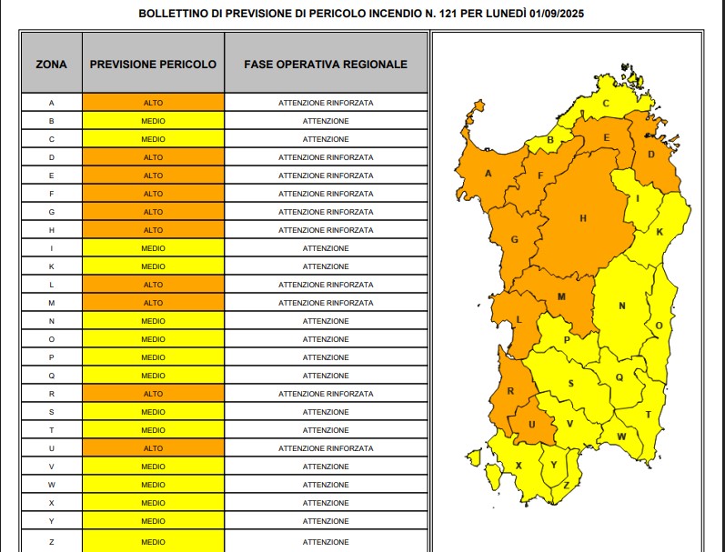 La Protezione civile regionale ha diratamo il Bollettino di previsione di Pericolo incendio, numero 121, che prevede per la giornata di lunedì 1 settembre, l’allerta di colore arancione per rischio incendi (pericolosità alta) nel territorio.