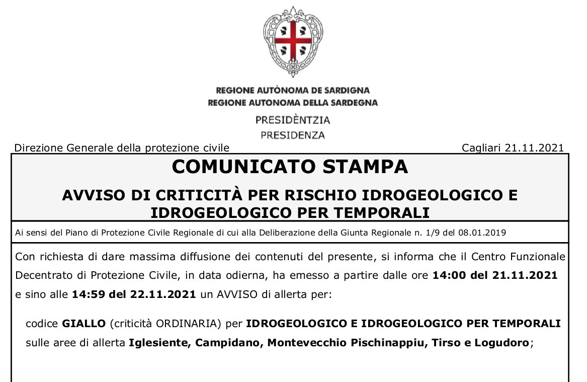 codice GIALLO (criticità ORDINARIA) per IDROGEOLOGICO E IDROGEOLOGICO PER TEMPORALI sulle aree di allerta Iglesiente, Campidano, Montevecchio Pischinappiu, Tirso e Logudoro.
