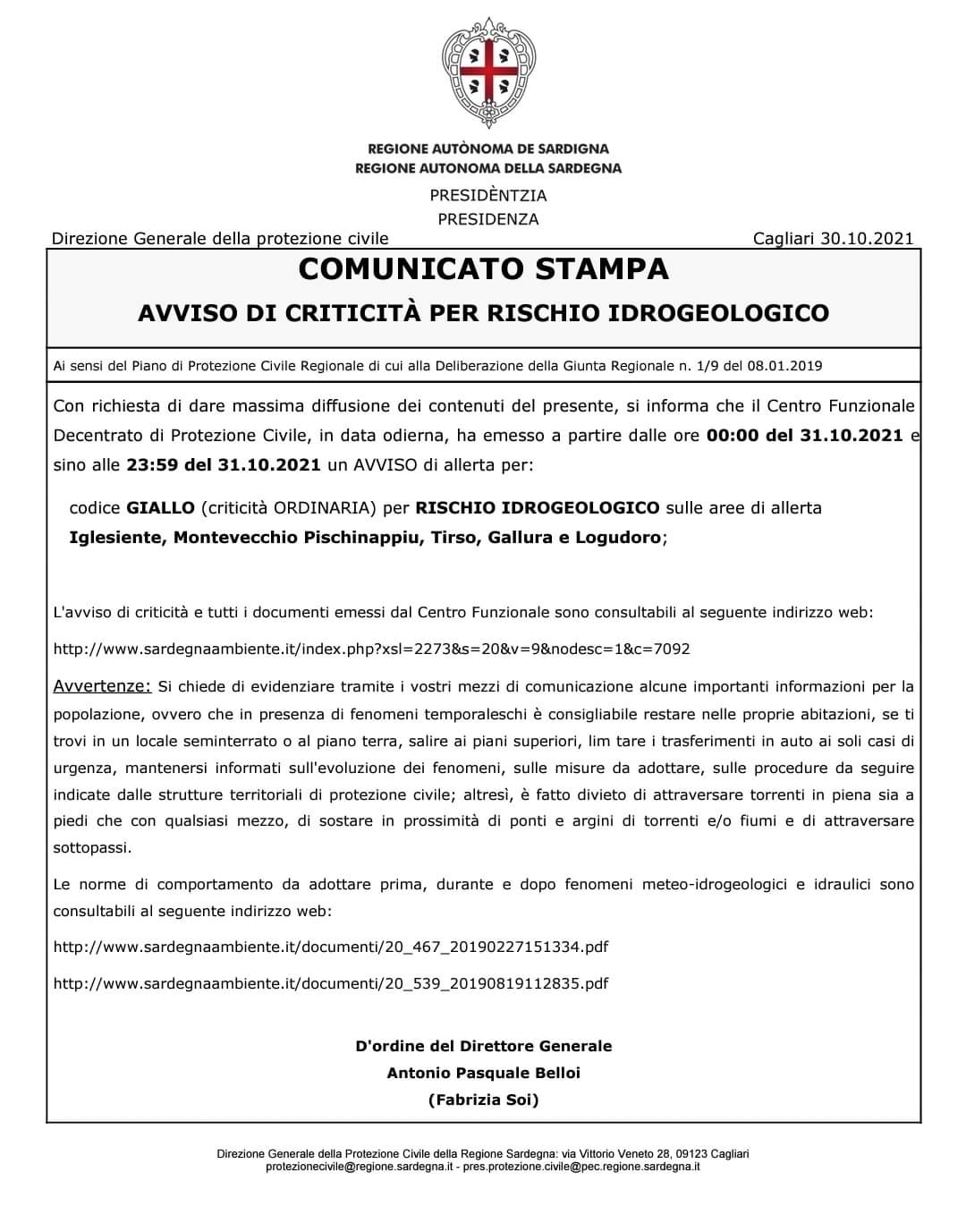 La protezione civile regionale ha diramato un'allerta di criticità ordinaria dal punto di vista idrogeologico (codice giallo) per la giornata del 31 ottobre.
