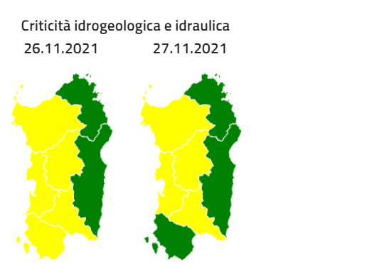 - codice GIALLO (criticità ORDINARIA) per RISCHIO IDRAULICO E IDROGEOLOGICO sulle aree di allerta Campidano, Montevecchio Pischinappiu, Tirso e Logudoro.