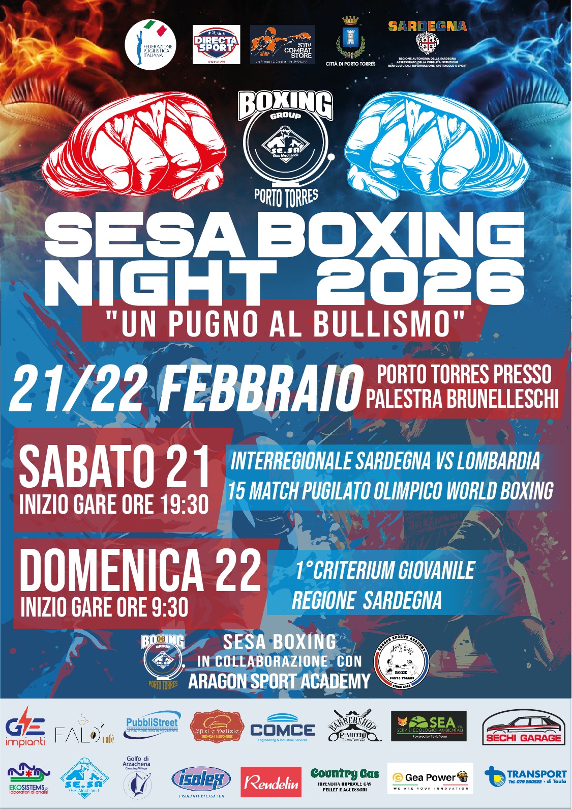La città di Porto Torres si prepara ad accogliere la V^ edizione della manifestazione pugilistica "SE.SA BOXING NIGHT 2026 - Un pugno al Bullismo" organizzata, con il patrocinio del Comune, dall'associazione sportiva dilettantistica turritana SE.SA Boxing Group, in programma domani, 21 febbraio, a partire dalle 19:30 e domenica 22 febbraio dalle 9:30, nella palestra in via Filippo Brunelleschi.