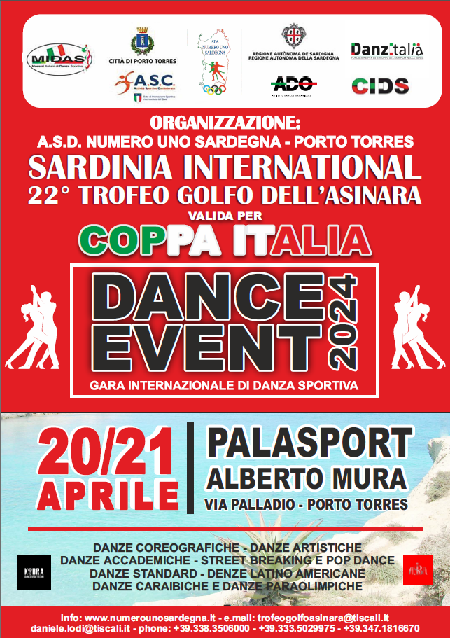 Sono 2653 gli atleti che quest’anno prenderanno parte al Sardinia International Dance Cup - 22° Trofeo Golfo dell'Asinara, la gara internazionale di danza sportiva organizzata dalla società ASD Numero Uno Sardegna, in programma sabato 20 e domenica 21 aprile nel Palazzetto dello sport comunale “Alberto Mura” di Porto Torres.