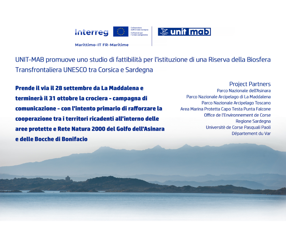 Il programma UNIT-MAB, è stato approvato nell’ambito del Programma INTERREG VI A Italia-Francia “Marittimo” 2021-2027 e vede come ente Capofila l’Office de l’Environnement de la Corse (Francia) con un ampio partenariato istituzionale e scientifico che include: Regione Autonoma della Sardegna, Parco Nazionale dell’Asinara, Parco Nazionale Arcipelago di La Maddalena, Parco Nazionale Arcipelago Toscano, Area Marina Protetta di Capo Testa – Punta Falcone, la Riserva delle Bocche di Bonifacio, Université de Corse Pasquale Paoli (FR), Département du Var (FR)
