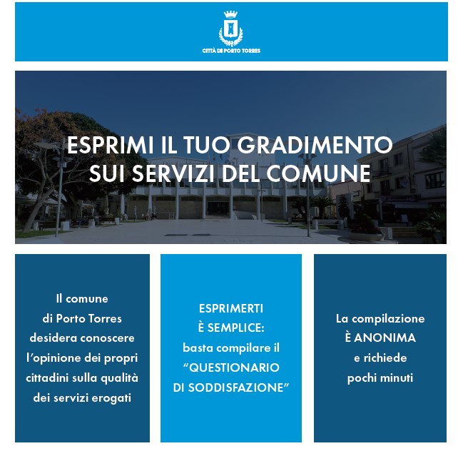 Il Comune di Porto Torres riconosce la centralità delle opinioni espresse dagli utenti sui servizi erogati dall'Ente. Per le pubbliche amministrazioni la misurazione del livello di soddisfazione dei propri cittadini rappresenta, infatti, il punto di riferimento di ogni strategia di intervento sui servizi, orientata al soddisfacimento delle esigenze della comunità nel suo complesso o di particolari categorie con specifiche necessità.