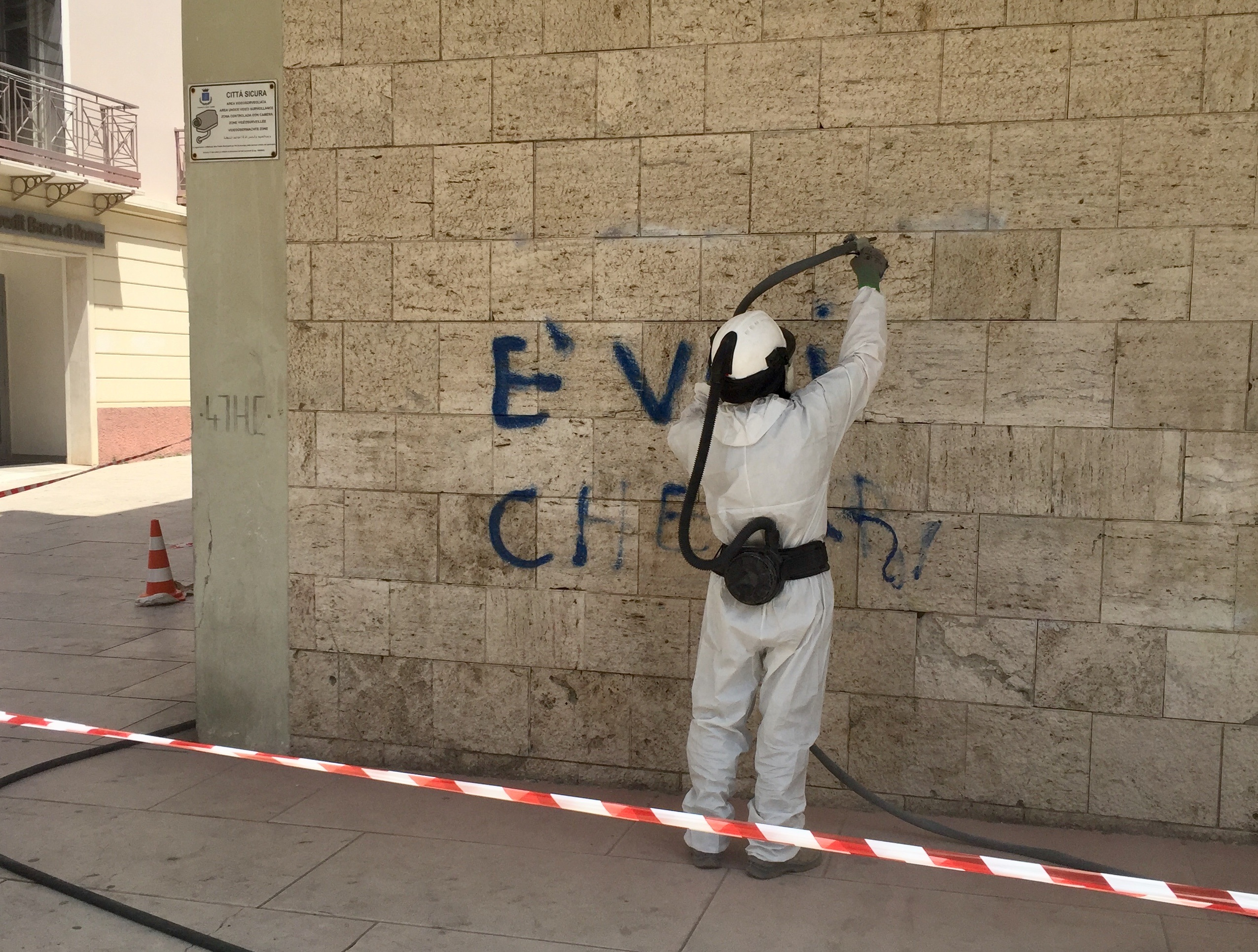 «Nel corso degli anni diversi edifici comunali sono stati presi di mira da alcuni incivili che con le bombolette di vernice spray hanno imbrattato le facciate. Il capitolato del servizio rifiuti – sottolinea l'Assessora all'Ambiente, Cristina Biancu – prevede l'esecuzione degli interventi di rimozione di queste scritte. Abbiamo ritenuto di dover avviare le operazioni di pulizia dal palazzo comunale, per dare un maggiore decoro allo stabile in centro città e certamente più in vista». I lavori vengono eseguiti attraverso una stazione mobile di sabbiatura che permette di rimuovere la vernice senza intaccare l'integrità delle pareti e limitando le emissioni di polveri. «L'azienda ha rimosso anche le scritte alle estremità delle panchine presenti in Piazza Umberto I, anch'esse imbrattate nel corso degli anni. Il capitolato prevede ulteriori interventi – conclude l'Assessora – che nelle prossime settimane saranno eseguiti in altri edifici pubblici».