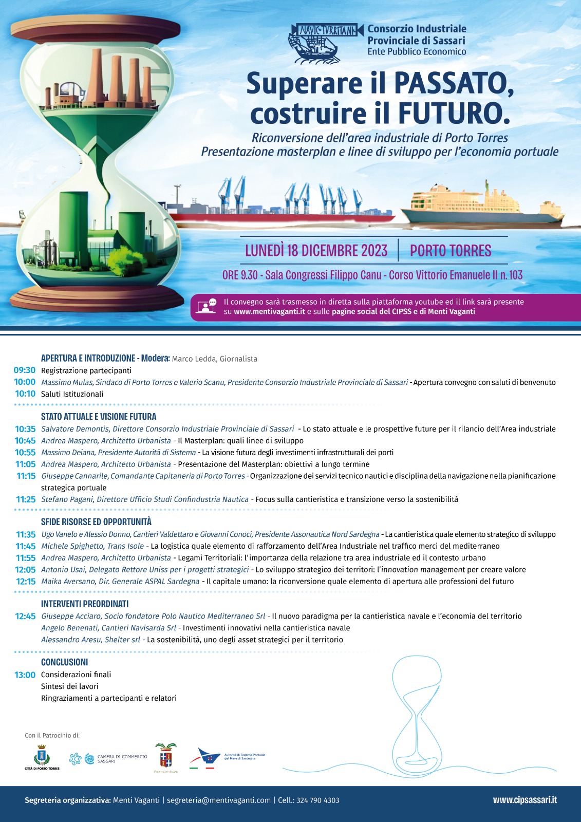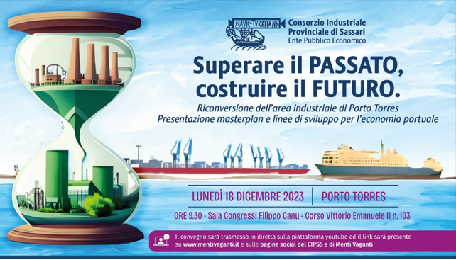 Nasce con questi presupposti il convegno organizzato dal Consorzio Industriale Provinciale di Sassari, in collaborazione con il Comune, dal titolo "Superare il passato, costruire il futuro" in programma lunedì 18 dicembre a partire dalle ore 9,30 nella Sala Congressi "Filippo Canu" a Porto Torres. Un evento che analizzerà, attraverso gli opportuni approfondimenti, il tema della riconversione dell'area industriale di Porto Torres a partire dalla presentazione del masterplan per la riqualificazione del porto industriale e le valutazioni che avranno come oggetto lo sviluppo dell’economia portuale.