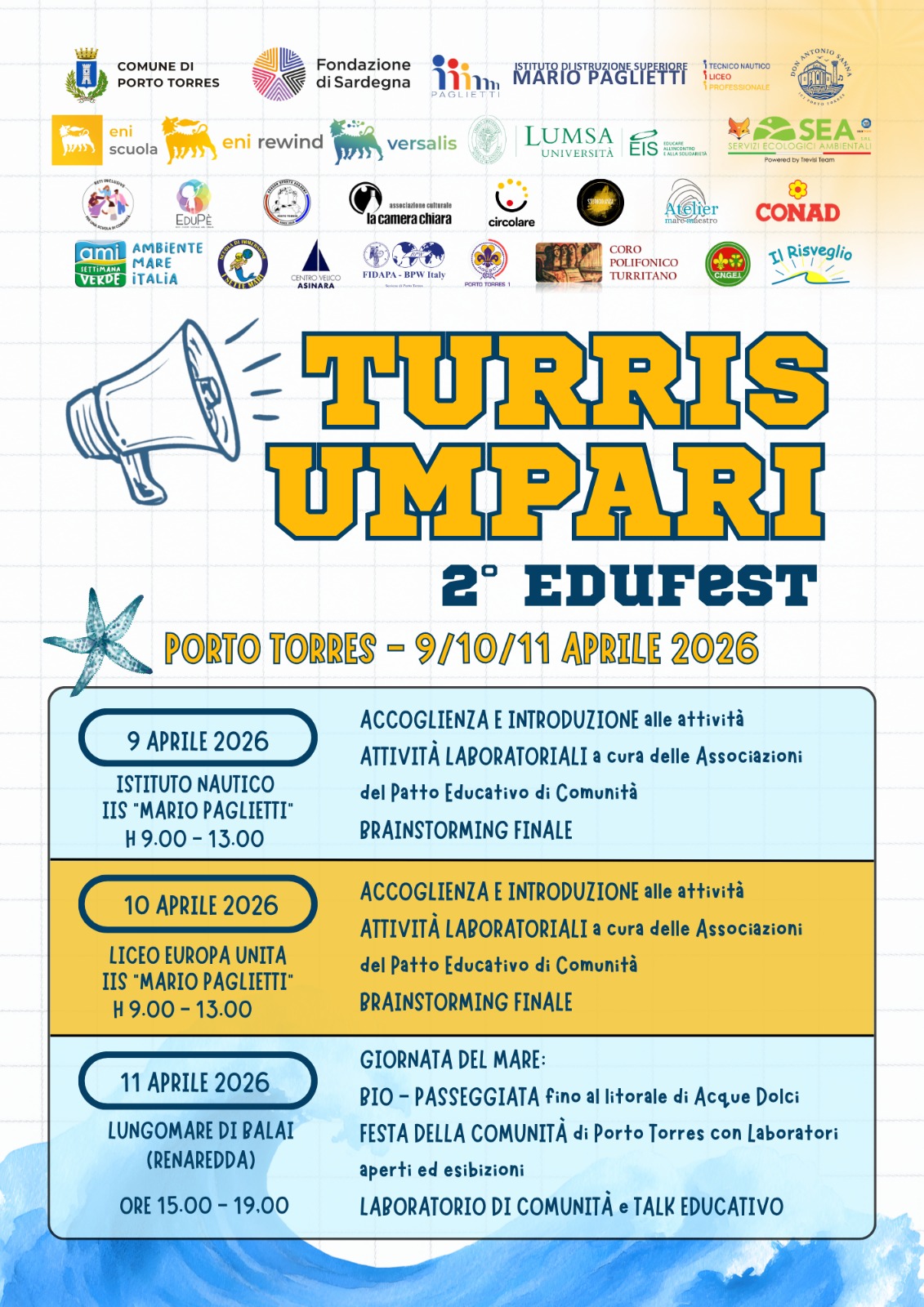 Edufest - “Turris Umpari” è promosso dal Settore Servizi Sociali del Comune di Porto Torres, in collaborazione con il gruppo di associazioni che fanno parte del Tavolo paritetico del “Patto Educativo di Comunità”, lo strumento che consente di attuare azioni educative innovative all'interno del contesto cittadino, attraverso una stretta collaborazione tra l'amministrazione comunale, la scuola, le famiglie, mondo dell’associazionismo e cittadini.