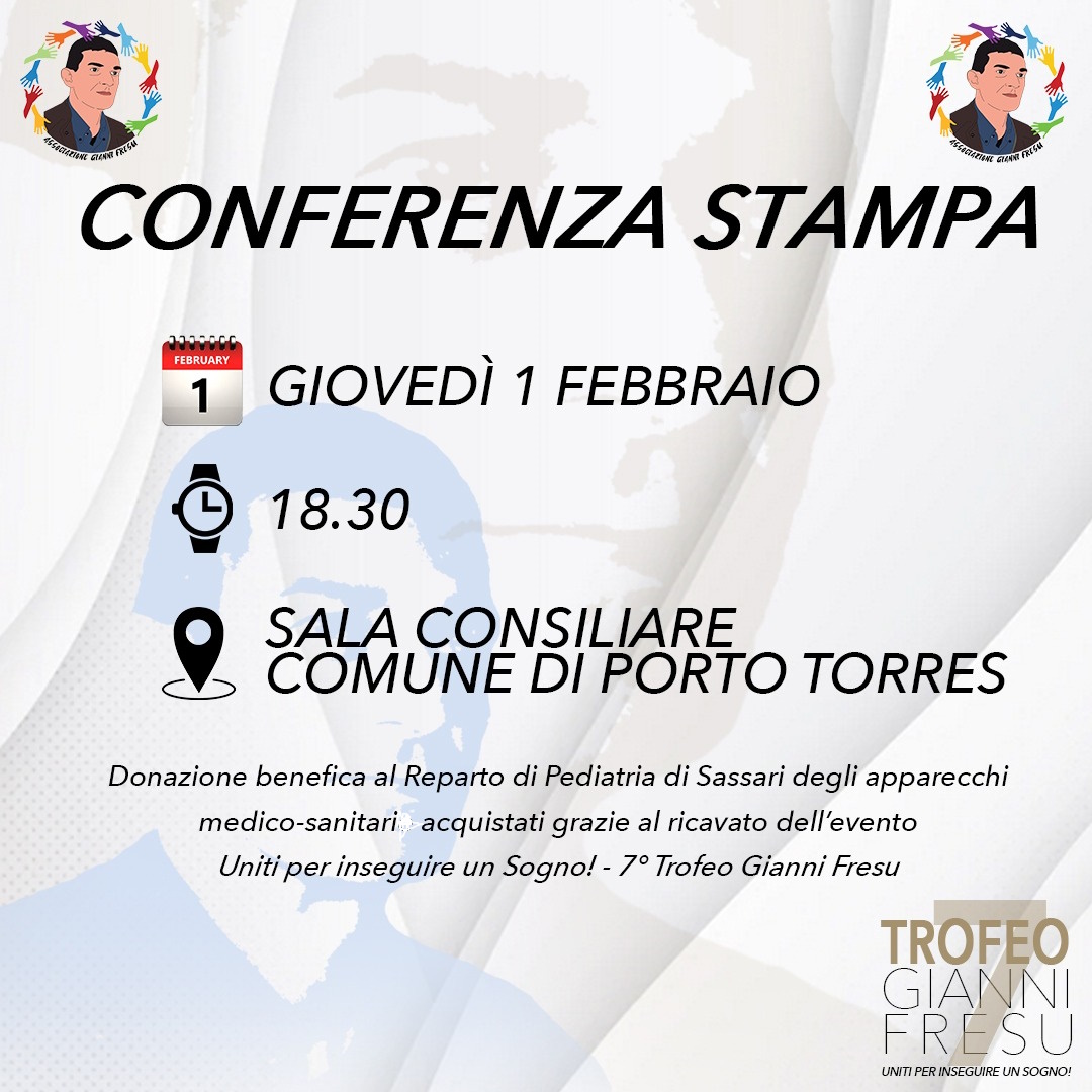 Giovedì 1 febbraio alle 18:30, nella sala consiliare del Comune di Porto Torres, l’Associazione Gianni Fresu consegnerà al reparto di Pediatria della Aou di Sassari il materiale medico-sanitario acquistato grazie al ricavato dell’evento benefico “Uniti per inseguire un Sogno! - 7° Trofeo Gianni Fresu", organizzato a Porto Torres lo scorso mese di giugno.