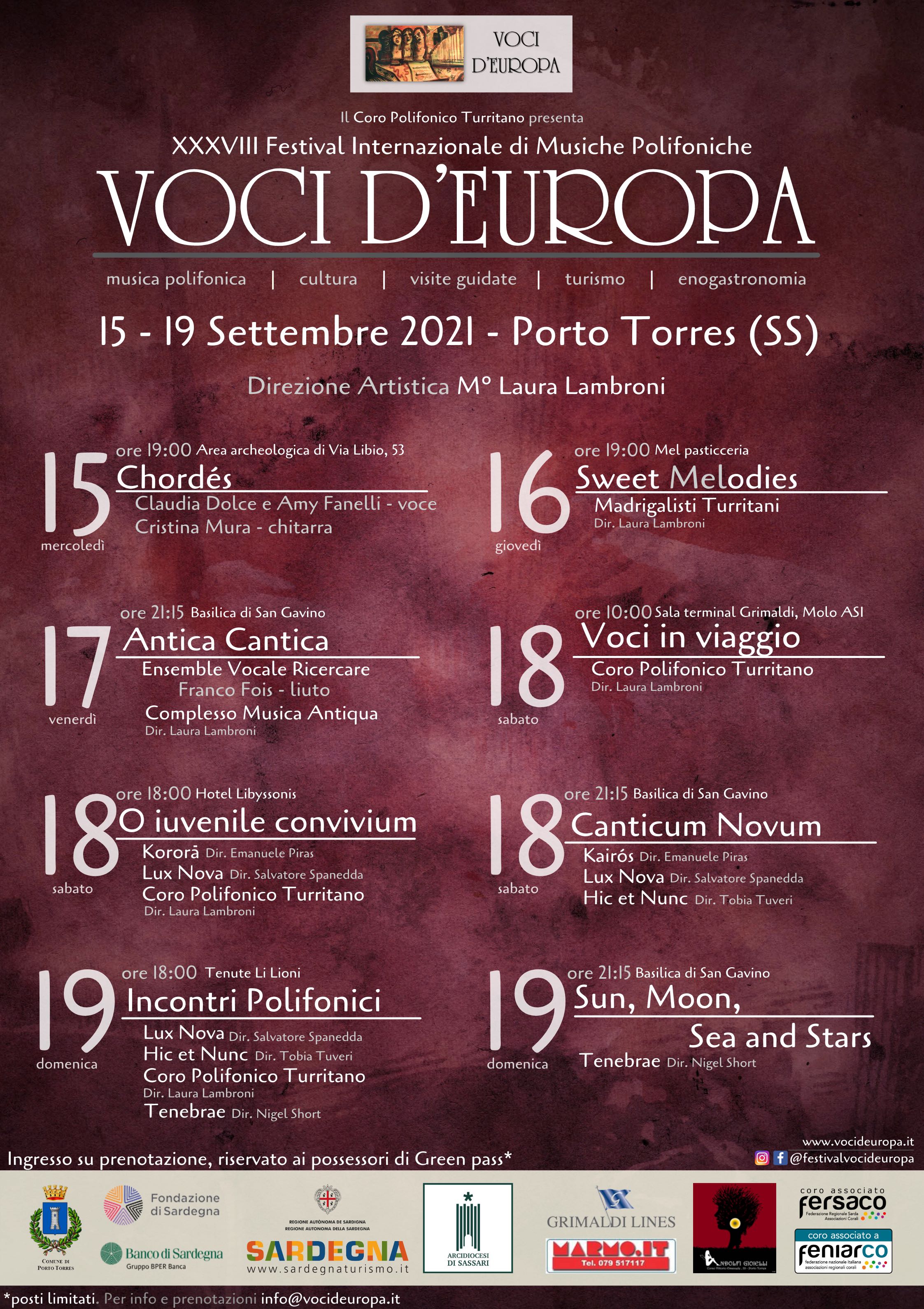 PARTNER. Il Festival Internazionale di Musiche Polifoniche “Voci d’Europa” si avvale del supporto della Fondazione di Sardegna, del Banco di Sardegna, del Comune di Porto Torres, dell’Assessorato al Turismo della Regione Sardegna, dell'Ufficio dei Beni culturali dell'Arcidiocesi di Sassari, della Parrocchia Santi Martiri Turritani, della compagnia di navigazione Grimaldi Lines, di Andolfi Gioielli e di Marmo.it.
