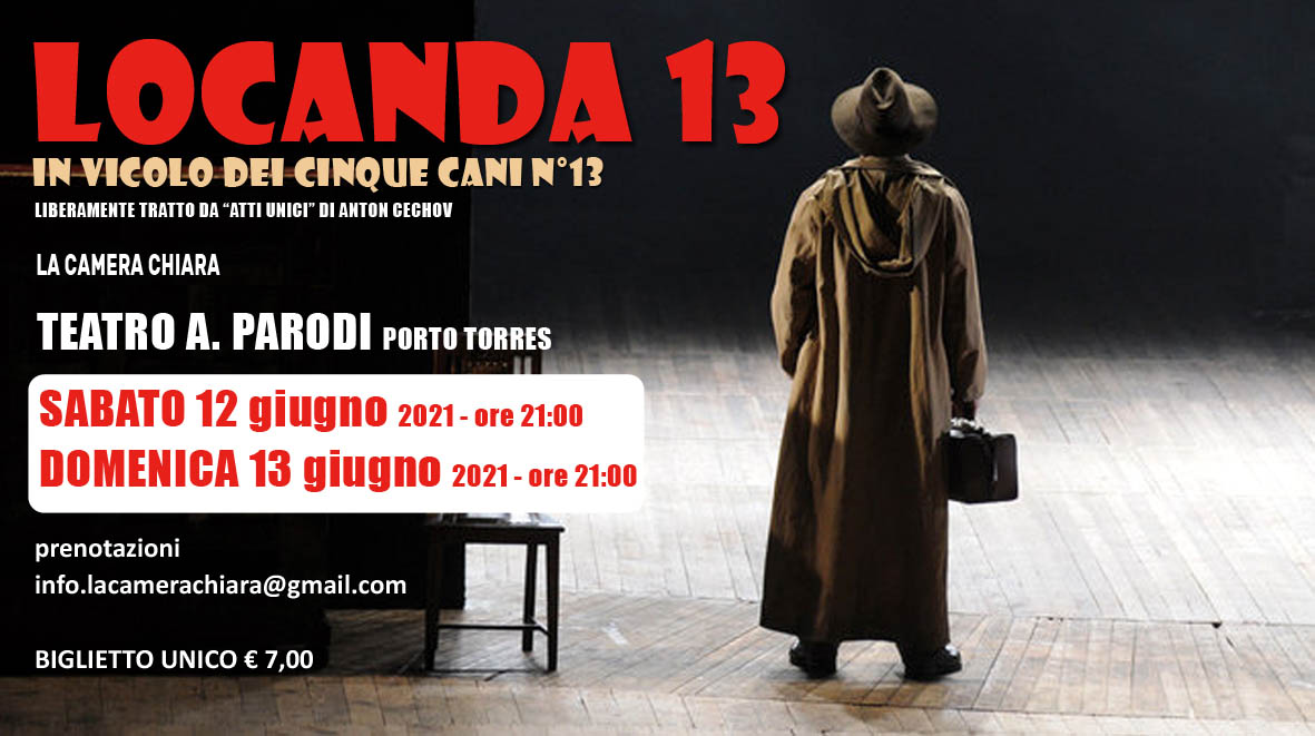 Sabato 12 e domenica 13 giugno alle ore 21:00 presso il Teatro A. Parodi, la compagnia “La camera chiara” porta in scena la nuova produzione teatrale dal titolo: “LOCANDA 13”, liberamente ispirata agli atti unici di Anton Cechov. Lo spettacolo rientra nel cartellone di eventi programmati da “La camera chiara” per il 2021 e sostenuti dalla Fondazione di Sardegna e dal Comune di Porto Torres.