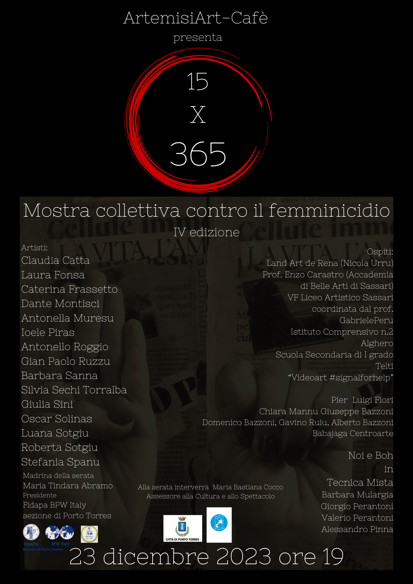 Ogni giorno dell’anno, da gennaio a dicembre, almeno una donna in Italia si converte in una vittima. Quindici artisti si confrontano, affrontando la quotidianità della violenza di genere. A dieci anni dalla prima edizione ritorna all’ArtemisiArt-Cafè di Sabrina Sotgiu e Giuseppe Masia, l’esposizione di un collettivo di 15 artisti, curata da Luana Sotgiu e Silvia Sechi, nata come reazione culturale alla violenza di genere. Quest’anno l’accento verrà posto in particolare sulla sensibilizzazione dell’importanza della richiesta di aiuto da parte delle vittime.