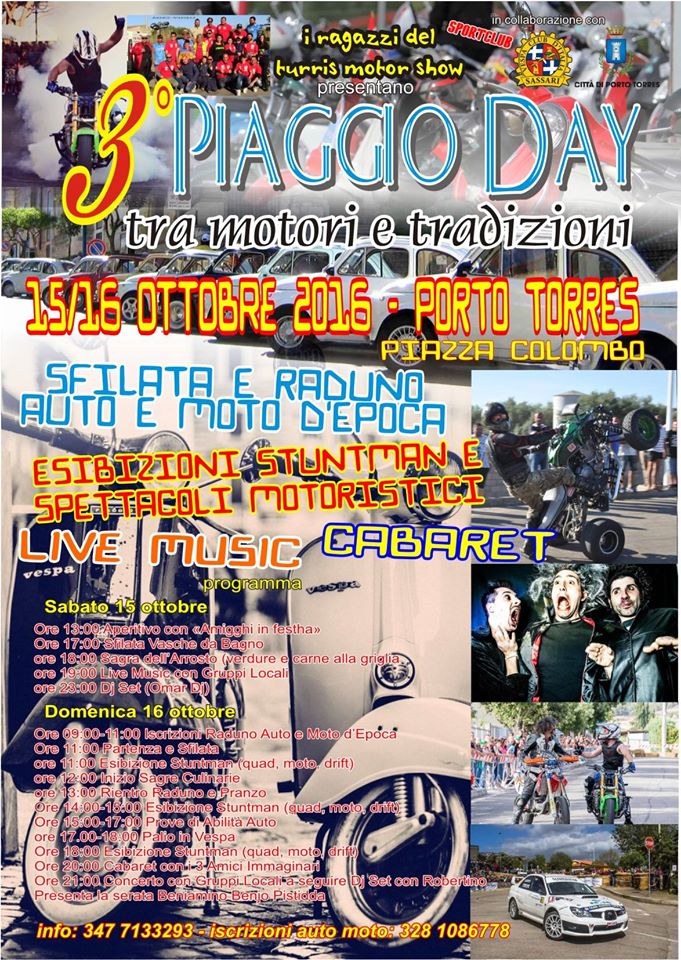 I ragazzi del Turris Motor Show presentano la terza edizione del Piaggio Day. Il programma prevede sfilate e raduno auto e moto d'epoca, esibizione stuntman e spettacoli motoristici, musica dal vivo e cabaret.