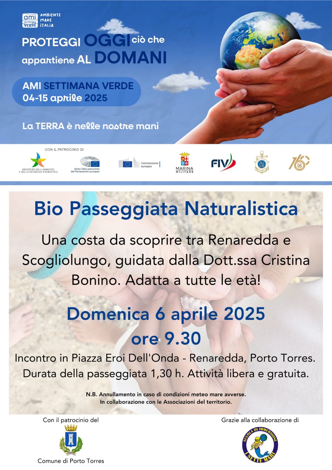 In occasione della Settimana Verde evento Nazionale organizzato da AMI (Ambiente Mare italia) dal 4 al 15 aprile con slogan “proteggi oggi ciò che appartiene al domani”, nella città di Porto Torres si svolgeranno 4 eventi in collaborazione con le Associazioni del territorio, mirati alla cittadinanza di tutte le età, gratuiti, per sensibilizzare e divulgare valori di Ambiente Mare e Sostenibilità. Gli eventi sono tutti coordinati e guidati dalla referente AMI Dott.ssa Bonino Cristina in collaborazione con l’ASD i sette mari.