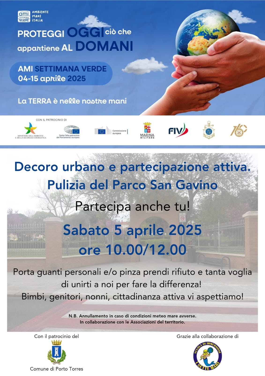 Azione pratica di rimozione rifiuti, pulizia del parco di San Gavino con raccolta e differenziata, evento di partecipazione attiva e coinvolgimento bimbi, genitori, nonni e cittadini al decoro urbano.