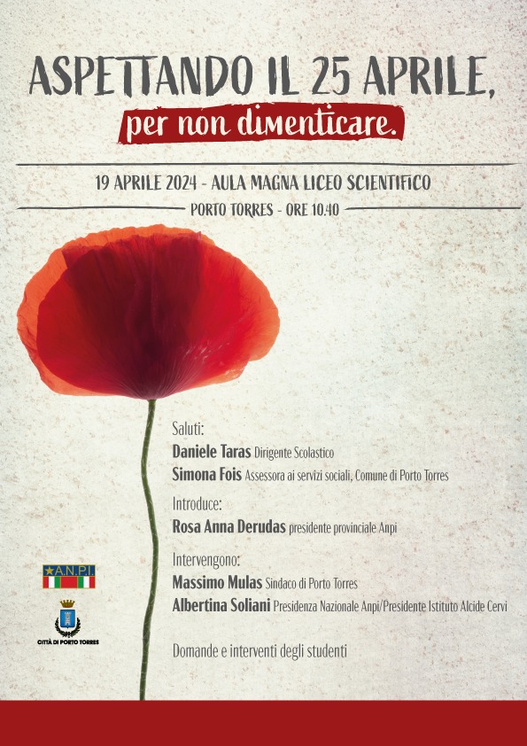 É l’obiettivo dell’incontro con le studentesse e gli studenti delle classi 5° dell’Istituto “Mario Paglietti” di Porto Torres dal titolo "Aspettando il 25 Aprile, per non dimenticare" organizzato dall’amministrazione comunale, in collaborazione con l’Associazione Nazionale Partigiani, in programma venerdì 19 aprile alle 10:40 nell’Aula Magna del liceo scientifico “Europa unita” in via Bernini.