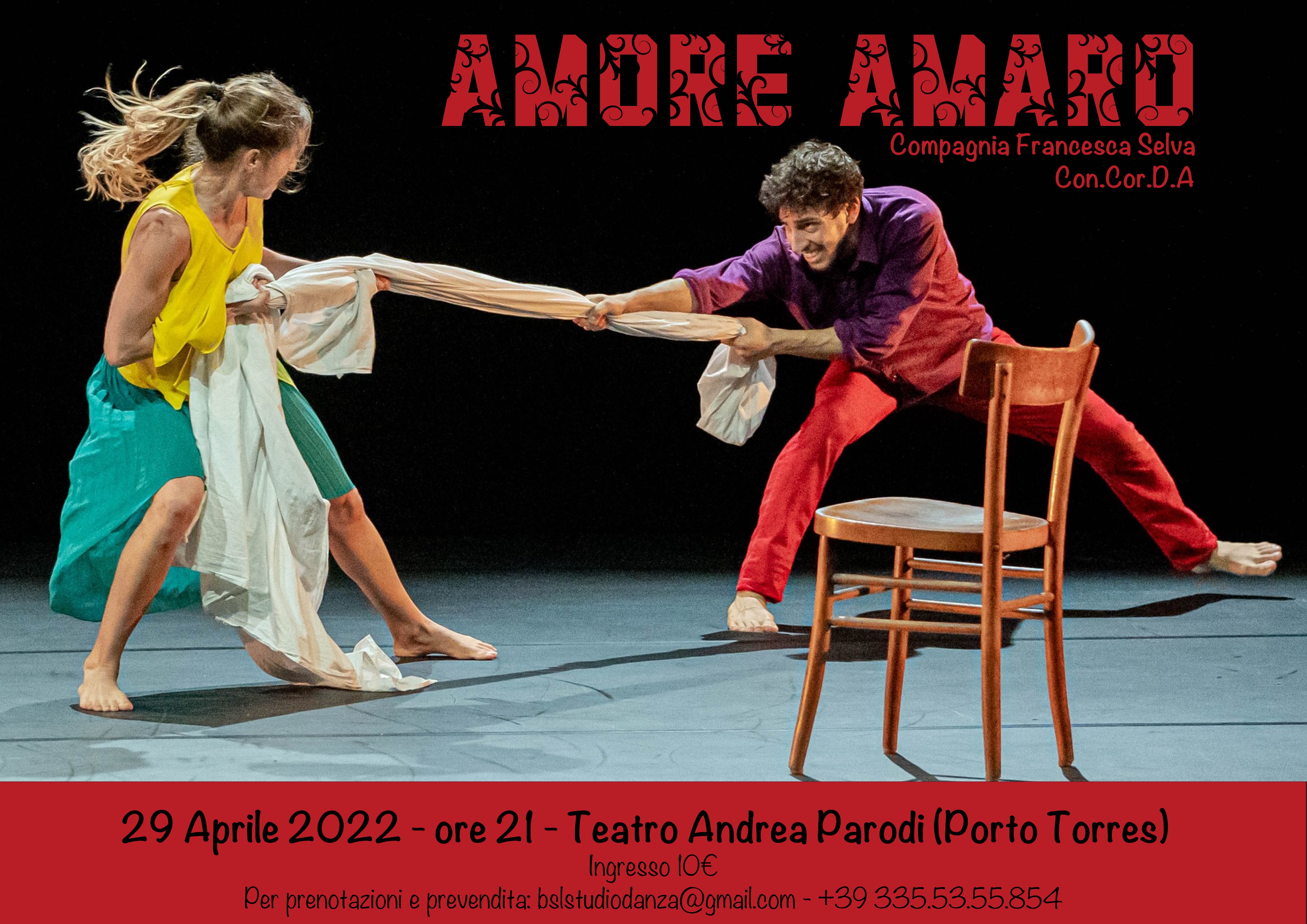 Amore Amaro è una delle produzioni che sintetizza al meglio la ricerca coreografica di Francesca Selva. Nella coreografia, i danzatori Claudia Mazziotti e Luciano Nuzzolese vestono i panni di un Romeo e di una Giulietta contemporanei e just married (finalmente sposati) e portano sul palco la quotidianità di un amore forte, intenso, a volte feroce. Nel soggetto ideato da Marcello Valassina, il cuore degli amanti si spezza all’improvviso. Cade. Precipita in un silenzio assordante. È pesante, ingombrante, eppure non fa rumore. Tace al mondo il suo dolore che si dimena come una bestia in trappola per poi scoppiare in un riso amaro che lo salverà.
