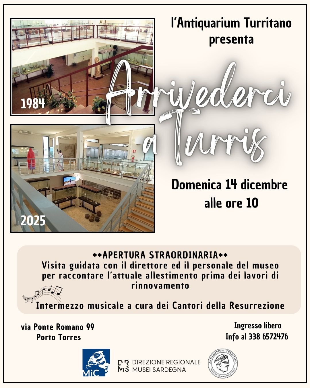 In previsione della chiusura temporanea del Museo Archeologico Nazionale Antiquarium Turritano di Porto Torres, necessaria alla realizzazione di un nuovo allestimento, la mattina di domenica 14 dicembre ci sarà un’apertura straordinaria, dalle ore 10:00 alle 12:00.