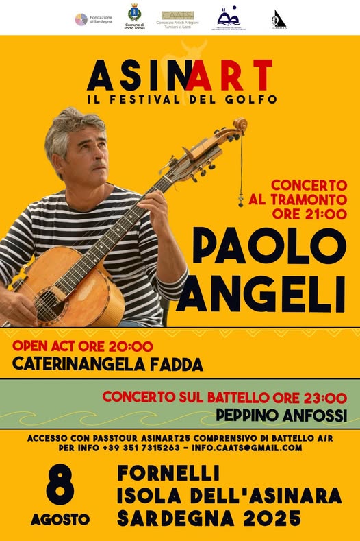 Angeli è un musicista d'avanguardia noto, oltre che per la sua musica, per la sua particolare chitarra sarda preparata a 18 corde. L’apertura del concerto è affidata alla chitarrista e compositrice Caterinangela Fadda, che alle ore 20:00, proporrà un repertorio inedito di circa 30’. La partenza è prevista alle 15.30 dalla marina di Stintino e il programma della giornata termina con la performance del violinista Peppino Anfossi, che accompagnerà con la propria musica i passeggeri del Battello AsinArt, esclusivo per il pubblico del Festival, durante il viaggio di ritorno a Stintino, alle ore 23:00.