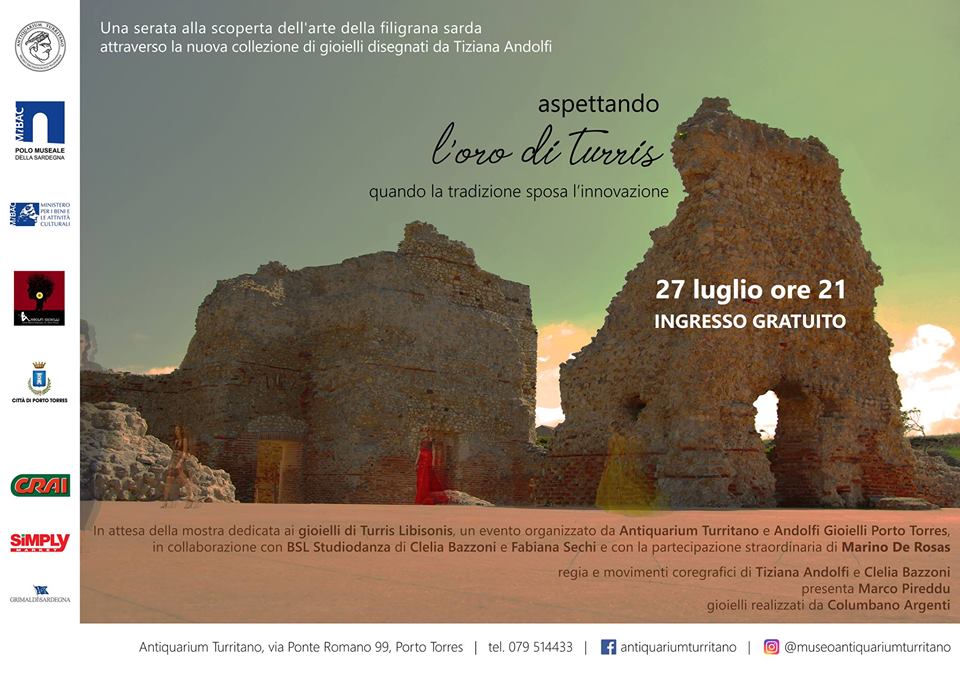 Quando la tradizione sposa l'innovazione. Una serata alla scoperta dell'arte della filigrana sarda attraverso la presentazione della nuova collezione di gioielli disegnata da Tiziana Andolfi. In attesa della mostra dedicata ai gioielli di Turris Libisonis, che si terrà in autunno presso l'Antiquarium Turritano, un evento dedicato all'arte e all'artigianato sardo, organizzato dall'Antiquarium Turritano e da Andolfi Gioielli Porto Torres, in collaborazione con BSL Studiodanza di Clelia Bazzoni e Fabiana Sechi, con la partecipazione straordinaria del chitarrista Marino De Rosas.