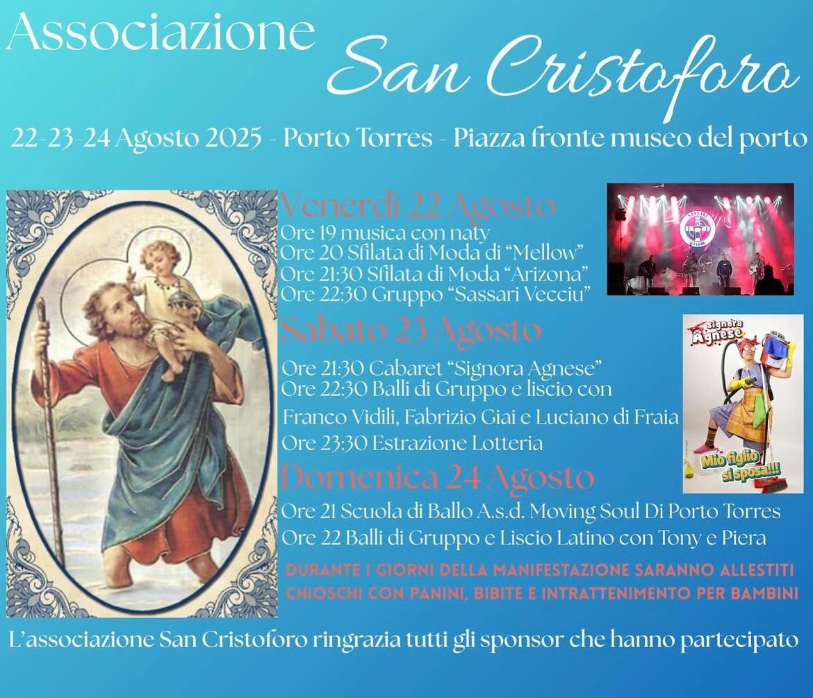 - Domenica 24 Agosto Ore 21:00 Scuola di Ballo A.S.D. Moving Soul di Porto Torres; Ore 22:00 Balli di Gruppo e Liscio Latino con Tony e Piera.