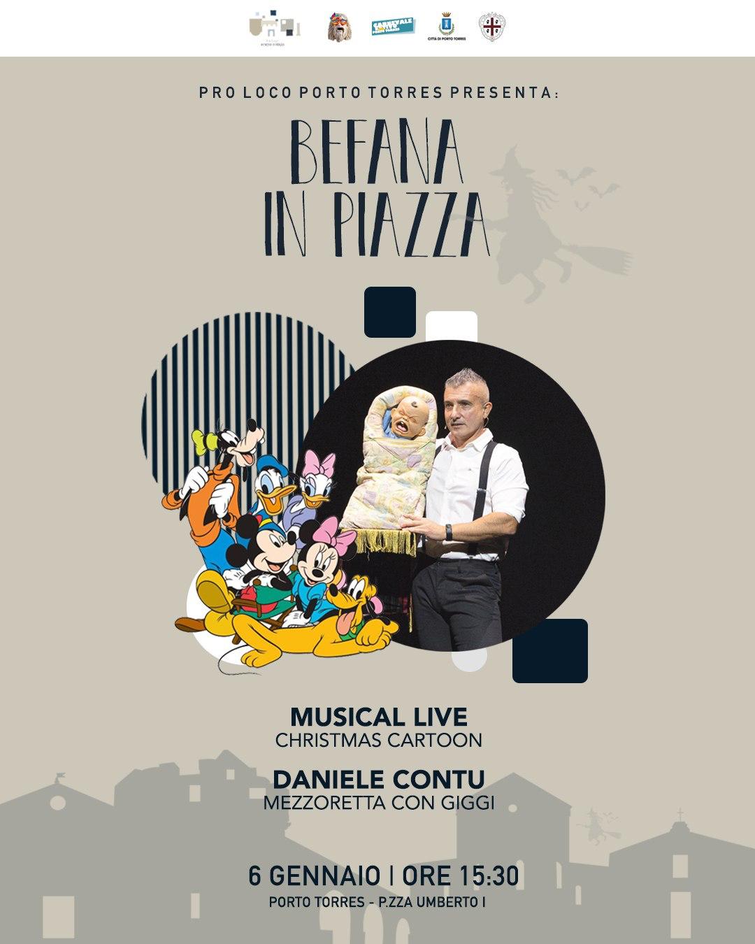 Come tutti gli anni, la Pro loco di Porto Torres con la "Befana in Piazza" farà divertire grandi e piccini, ospiti sul palco: Musical Cartoon Christmas ed il ventriloquo Daniele Contu.