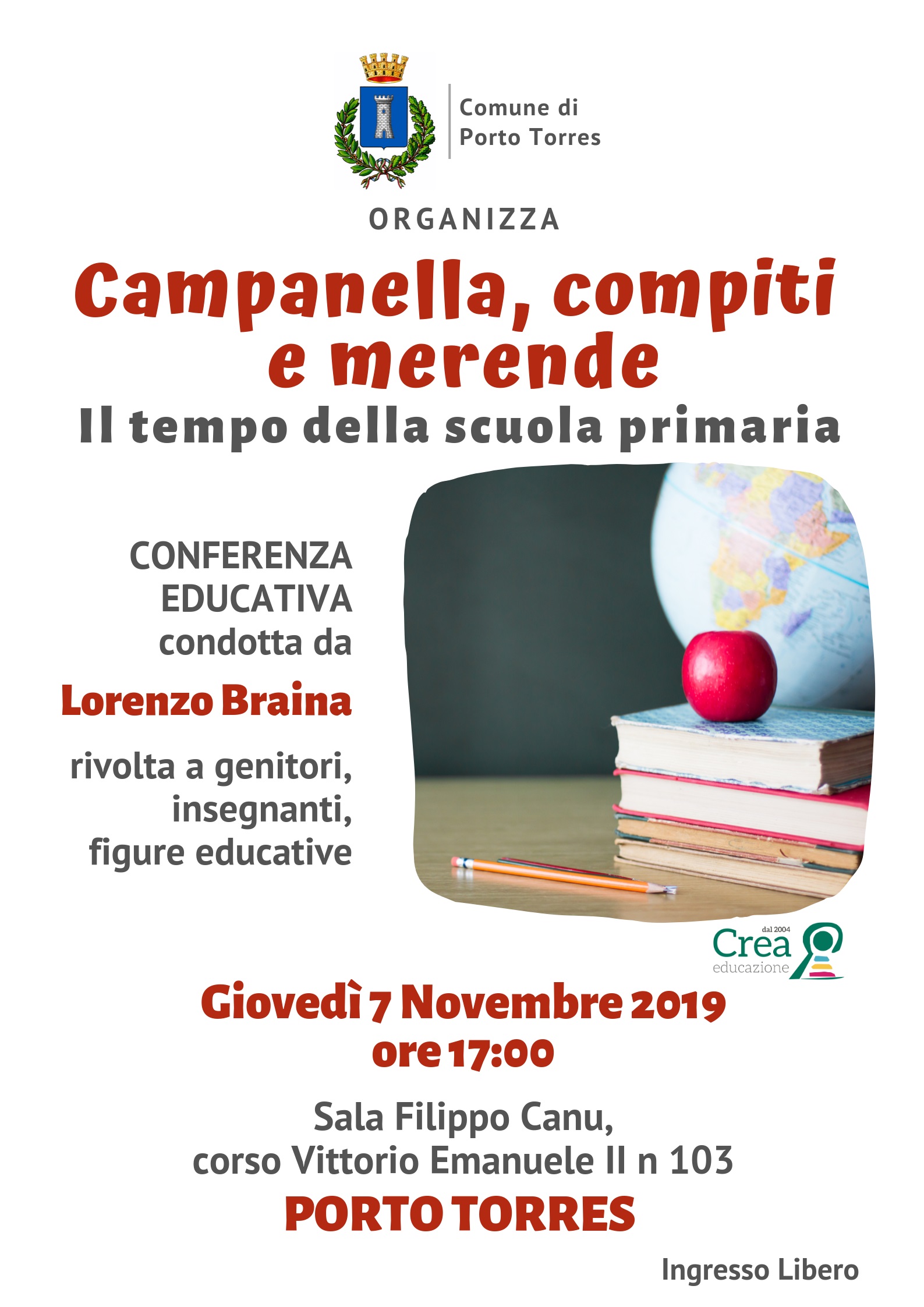 Un nuovo appuntamento con le conferenze educative di Lorenzo Braina curate dal Centro CREA, organizzate dal Comune di Porto Torres, rivolte a genitori, insegnanti e a tutta la comunità educante. La nuova conferenza educativa si intitola “Campanella, compiti e merende. Il tempo della scuola primaria” e affronterà alcune delle questioni centrali legate alla specifica fase evolutiva dei bambini dai 6 ai 10 anni, impegnati nel complesso processo di scolarizzazione.