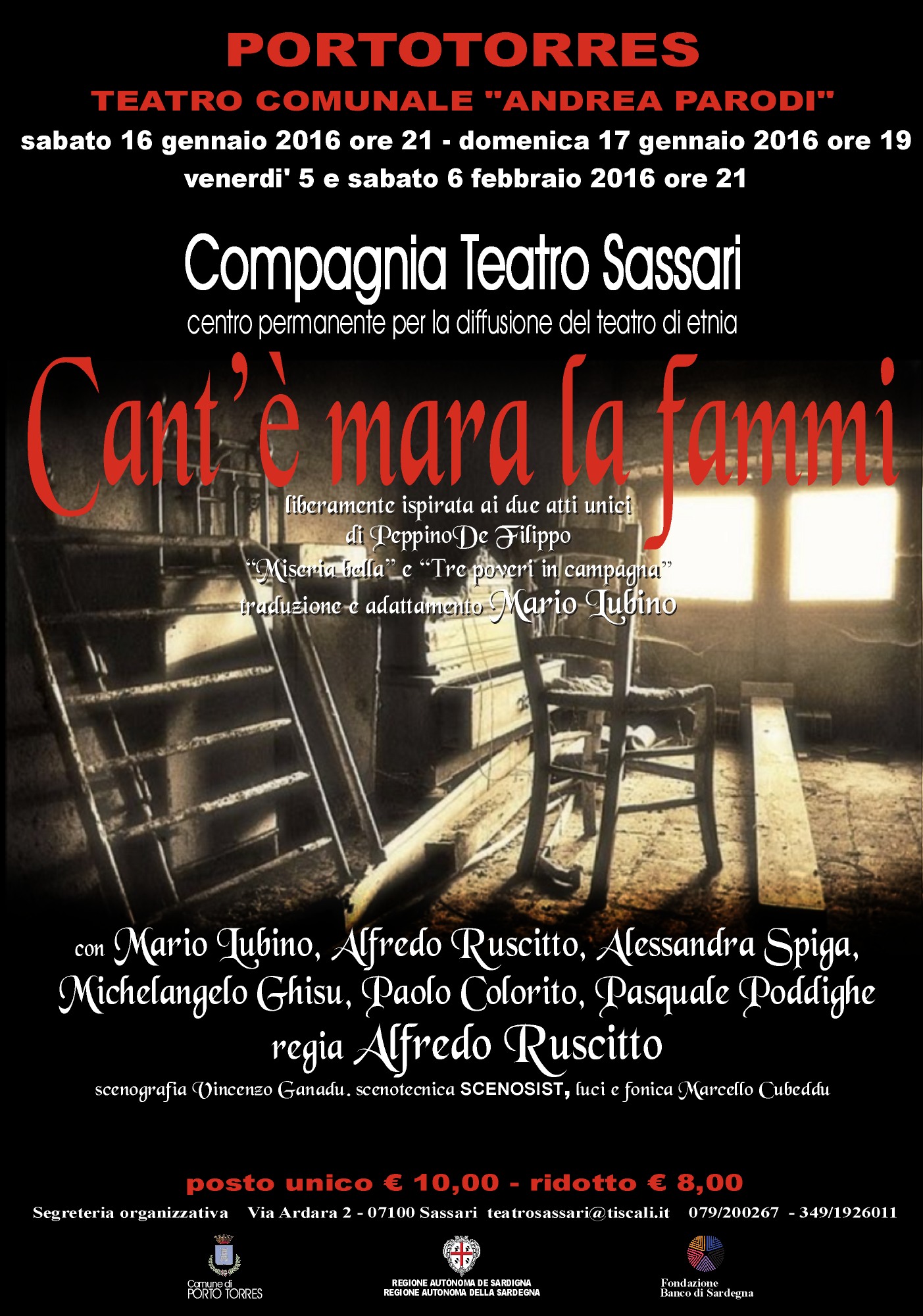 La Compagnia Teatro Sassari presenta "Cant'è mara la fammi" - "Miseria bella" e "Tre poveri in campagna", due atti unici di Peppino de Filippo, adattamento di Mario Lubino, regia Alfredo Ruscitto, con Mario Lubino, Teresa Soro, Alfredo Ruscitto, Rosario Morra, Michelangelo Ghisu.