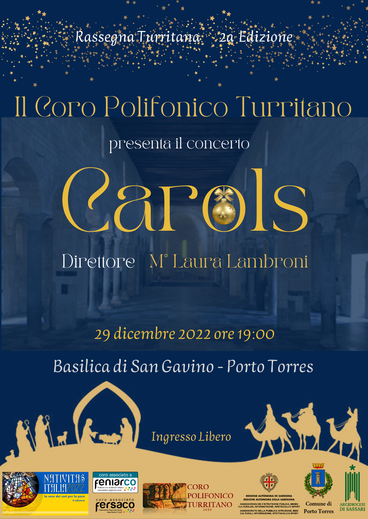 Il Coro Polifonico Turritano diretto dal M° Laura Lambroni si esibirà nella Basilica di San Gavino per offrire il tradizionale concerto di Natale dal titolo Carols. Il concerto è inserito nel cartellone di Nativitas Italia 2022, un progetto di rete della coralità italiana creato dalla FENIARCO (Federazione Nazionale Italiana Associazioni Regionali Corali) e nel calendario degli eventi del Natale Turritano.